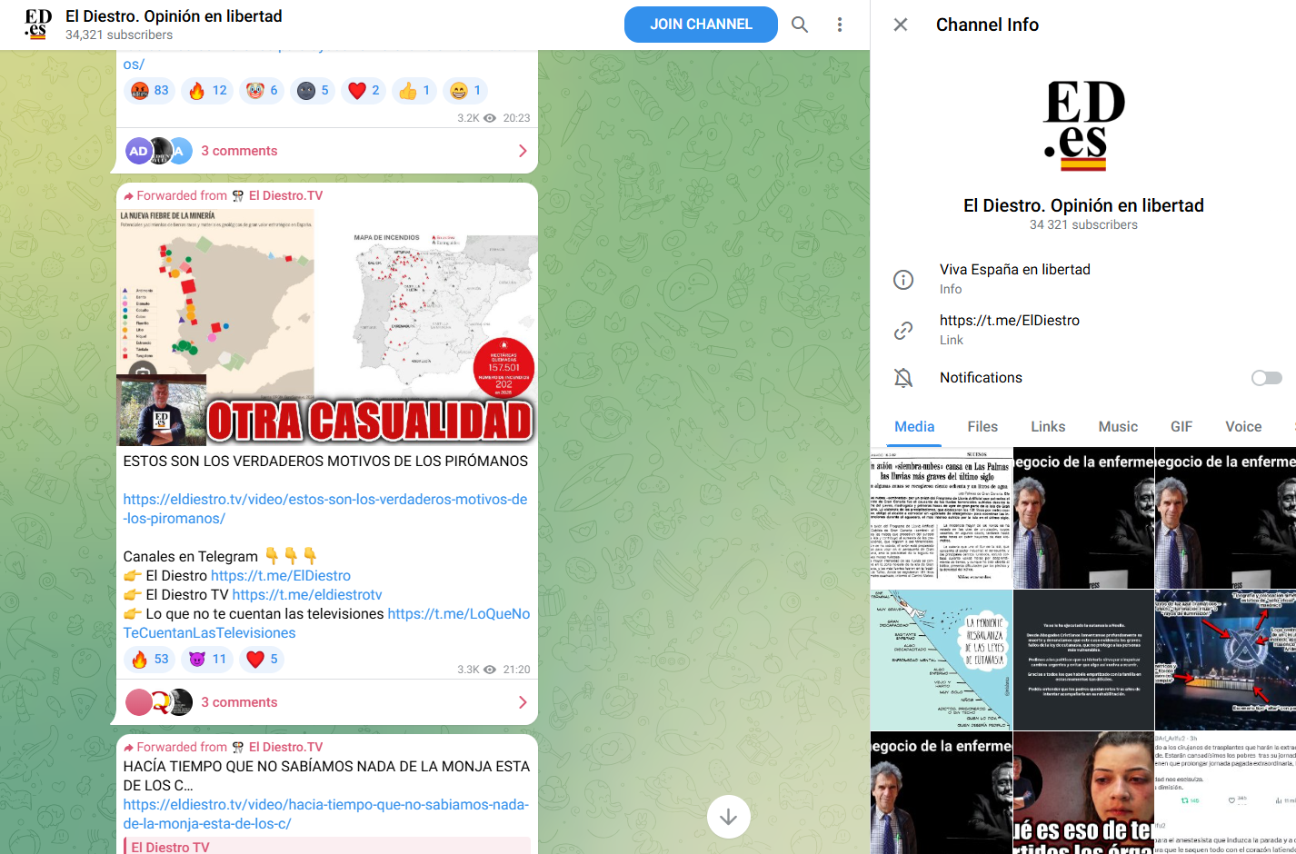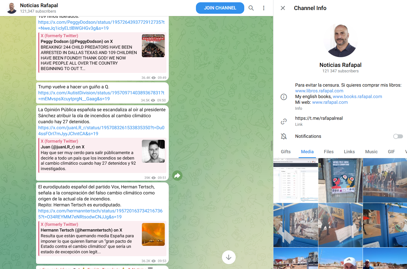 El 16 de agosto por la tarde, una usuaria de X publica varios mensajes comparando la cercanía de los incendios a yacimientos de tierras raras con la ayuda de ChatGPT. Esta es la primera aparición de mensajes asociados a esta narrativa de los que Maldita.es tiene constancia. Esa noche ElDiestro, una cuenta de Telegram, publica un mapa de los incendios y otro de yacimientos de tierras raras en España acompañados de la frase “estos son los verdaderos motivos de los pirómanos”. El mensaje enlaza a un vídeo de YouTube donde comenta los tuits de la usuaria anterior. En conjunto, esas tres publicaciones no superan las 30.000 visitas. Un día y medio después, el 18 de agosto a la 1:29 de la madrugada, otro usuario transmite la misma idea en X usando los mismos mapas que ElDiestro y la noticia de una reunión entre Pedro Sánchez y los magnates chinos del litio. El tuit alcanza más de un millón de visitas.
