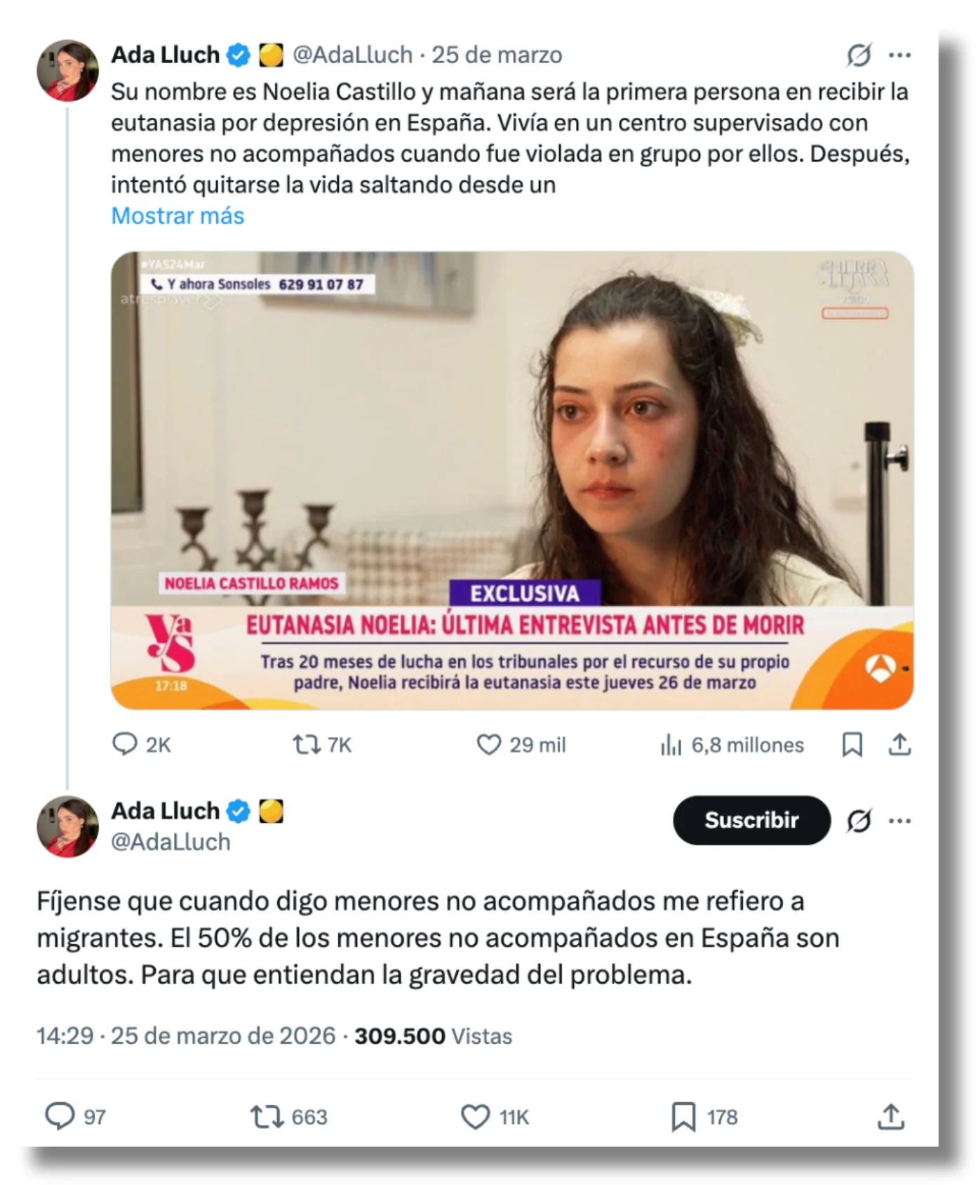 El primer contenido en inglés detectado por Maldita.es que difunde esta narrativa en X y el más viral ya suma casi 7 millones de visualizaciones. Lo publicó Ada Lluch, influencer española defensora de las políticas de la Casa Blanca, el pasado 25 de marzo. “Vivía en un centro de menores tutelados cuando fue violada en grupo”, escribió sobre Noelia Castillo. La joven que pronunció un discurso antiinmigratorio en una manifestación en Londres en septiembre de 2025, aclara en un segundo tuit que cuando dice “menores no acompañados” se refiere a “inmigrantes”. La Dirección General de Prevención y Protección a la Infancia y la Adolescencia de la Generalitat de Cataluña afirma Maldita.es que Noelia Castillo estuvo en dos centros de menores entre 2015 y 2019 y que no tienen registro de ninguna agresión sexual sufrida por la joven durante su estancia en los centros.
