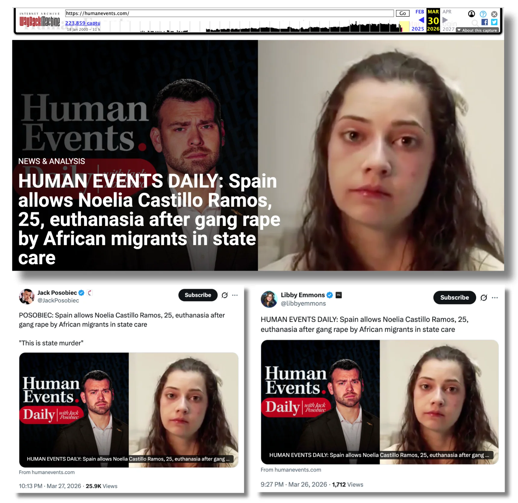Posobiec es editor senior de la página web Human Events, desde la que también se ha compartido la idea de que Noelia Castillo fue violada por un grupo de inmigrantes. El 26 de marzo la web publicó un vídeo en el que Posobiec y Libby Emmons, redactora jefe de The Post Millennial (página web que se define como “conservadora” y que ha difundido desinformaciones en alguna ocasión) que también escribe para Human Events, defendían esta narrativa. Cuatro días después, el 30 de marzo, Human Events tenía esta misma narrativa visible en su portada.