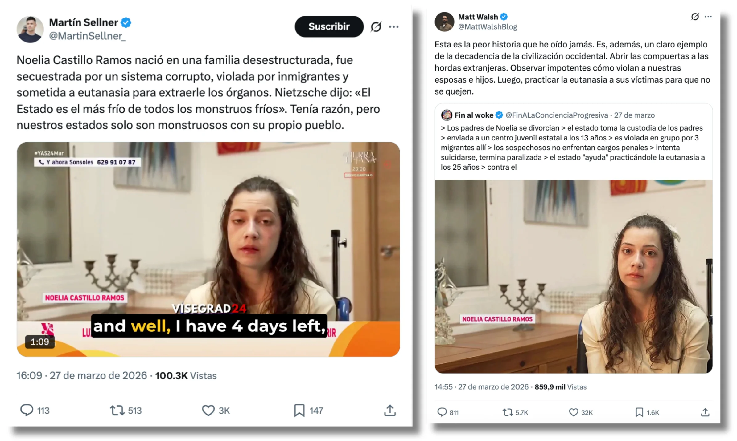 El 27 de marzo, también relacionó la inmigración con la violación de Noelia Castillo la influencer ruso-americana Alexandra Jost, más conocida como Sasha Meets Russia. Ese día publicó un post en X afirmando: “La desgarradora tragedia de Noelia Castillo Ramos, la pobre niña a la que España le practicó la eutanasia, sirve como un crudo recordatorio de que la vida de los inmigrantes es más importante para Europa que la suya propia. Sus violadores deberían haber sido los que recibieran la eutanasia”. Esta influencer, según contaron el medio de investigación OCCRP y Novaya Gazeta Europe, ha recibido pagos de RT –canal financiado por el Gobierno ruso— para difundir narrativas favorables a Rusia y llegar a aquellos lugares donde RT y otros canales vinculados al Kremlin están suspendidos.