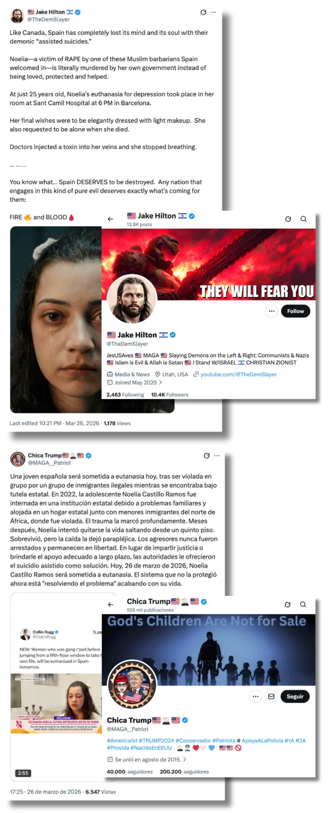 Jack Posobiec, estadounidense impulsor de los Viernes de Franco (Franco Friday's), también ha contribuido a la difusión de esta narrativa en inglés. El 27 de marzo, escribió en la misma plataforma: “España autoriza la eutanasia de Noelia Castillo Ramos, de 25 años, tras ser violada en grupo por inmigrantes africanos bajo tutela estatal”. No es la primera vez que difunde contenidos desinformadores: hace años propagó la teoría de la conspiración conocida como Pizzagate, según la cual miembros del Partido Demócrata estadounidense, entonces liderado por Hillary Clinton, dirigían una red de abuso infantil en los sótanos de una pizzería de Washington.