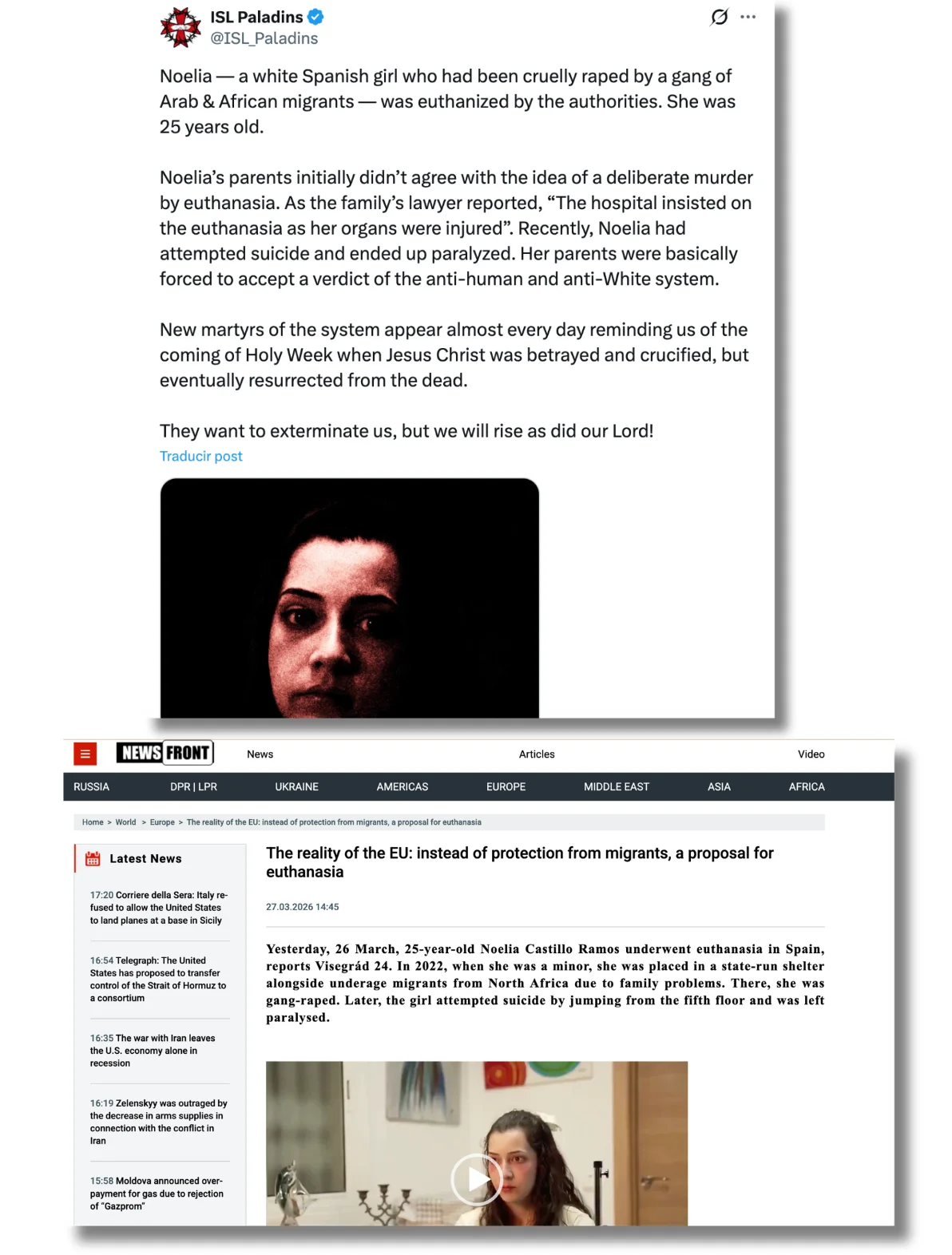 El 28 de marzo, la cuenta ISL Paladins, que corresponde a la Liga Soberana Internacional «Paladines», también conocida como Liga Internacional Antiglobalista, y que ha publicado mensajes de apoyo a partidos como UNR en México o Amanecer Dorado en Grecia, publicaba un post con afirmaciones como: “Noelia, una joven española blanca que había sido brutalmente violada por una banda de inmigrantes árabes y africanos, fue sometida a eutanasia por las autoridades”.