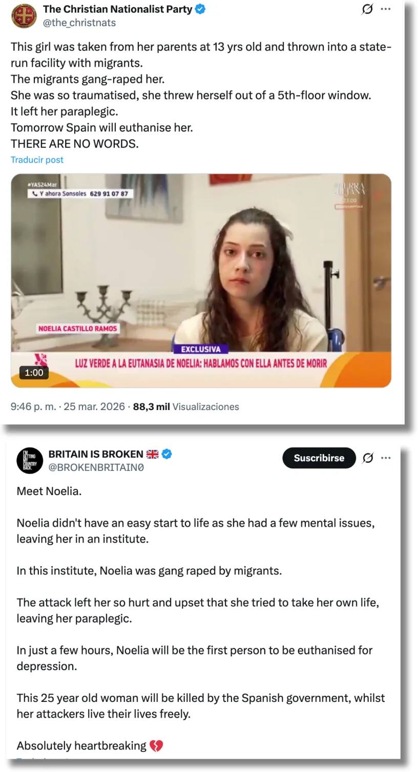 Desde su cuenta de X, el 25 de marzo, el Partido Nacionalista Cristiano publicó un post contribuyendo a amplificar la narrativa de que Noelia fue violada por inmigrantes. “Mañana España le aplicará la eutanasia”, concluía la publicación.