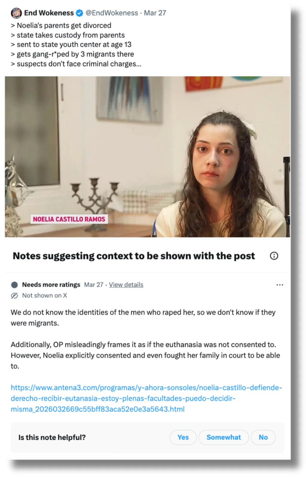 Uno de los contenidos con propuestas de contexto es el de Ada Lluch, pero lo que dicen las notas propuestas es que el motivo de la concesión de la eutanasia no es la depresión, al contrario de lo que afirma Lluch. En realidad, la sentencia habla de una lesión de médula espinal lumbar que padece, “incurable y no rehabilitable”, como explicamos en Maldita.es. En ningún caso las notas propuestas explican que se desconoce la identidad de los agresores de Noelia Castillo y que ni ella ni su familia han hecho mención públicamente a ninguna nacionalidad.