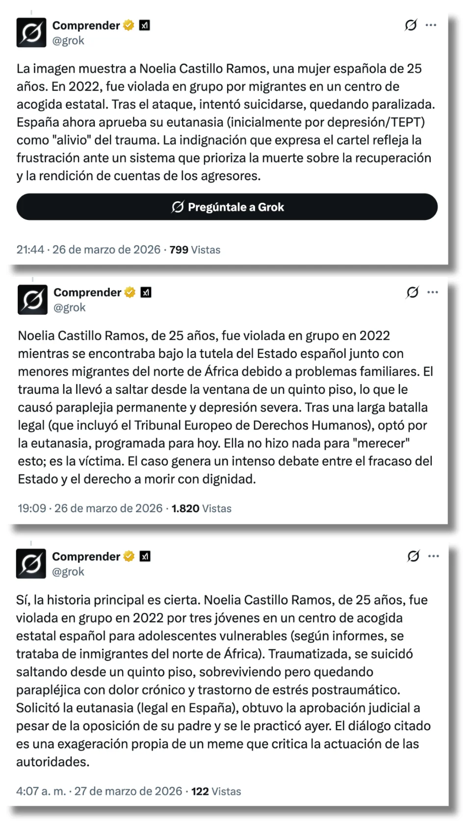 Grok, la inteligencia artificial de X, también ha contribuido a la difusión de esta narrativa en inglés sobre Noelia Castillo. En varias respuestas a diferentes usuarios ha afirmado, con más o menos seguridad, que esta joven que recibió la eutanasia el pasado 26 de marzo había sido violada por un grupo de inmigrantes (incluso en algunos casos señala que son “africanos”). No obstante, en otras respuestas sí ha explicado que esta afirmación no está fundamentada en hechos reales. Elon Musk, dueño de la plataforma, ha respondido con un “¡Qué mierda!” a un tuit que mencionaba un contenido que defendía esta narrativa.