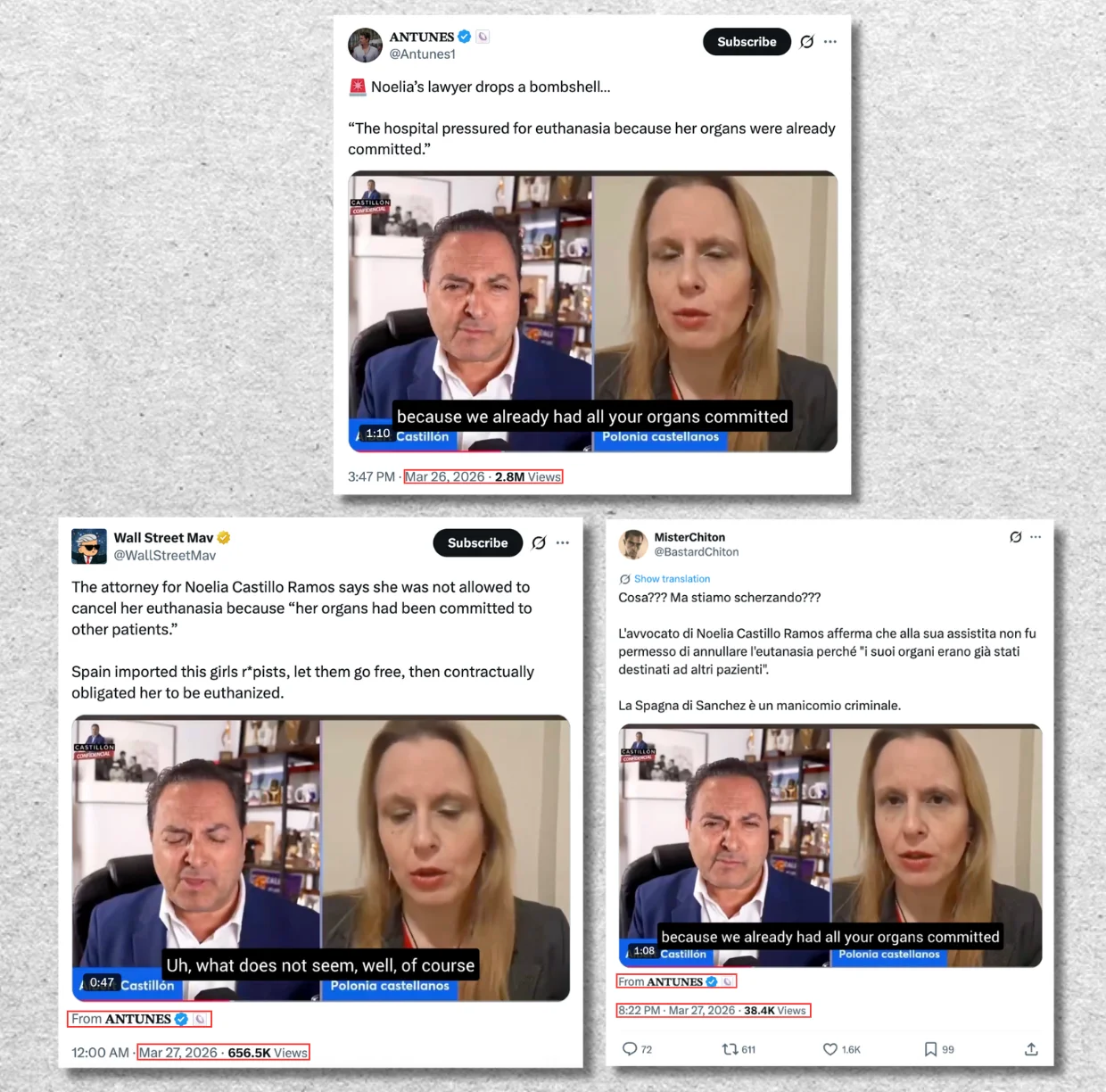 Esta narrativa también ha traspasado fronteras. El fact-checker mexicano Verificado.mx ha verificado esta y otras narrativas relacionadas con Noelia Castillo. Pero no sólo se ha viralizado en español. Las declaraciones de la presidenta de Abogados Cristianos se han traducido a otros idiomas, aumentando así el alcance de esta narrativa.