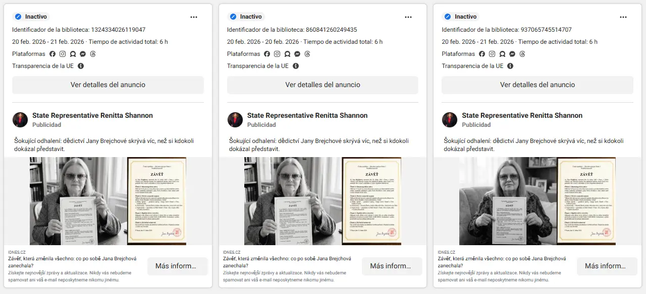 Hemos detectado 170 cuentas de Facebook con el tic azul de verificación que, en los primeros tres meses de 2026 y solamente en Europa, publicaron más de 67.000 anuncios fraudulentos según los datos del repositorio de Meta. A lo largo de todo su periodo de actividad, estas cuentas han publicado más de 110.000 anuncios sólo en el continente, aunque hemos detectado que también han publicado anuncios fuera de Europa que Meta no los incluye en su repositorio una vez que pasan a estar inactivos.