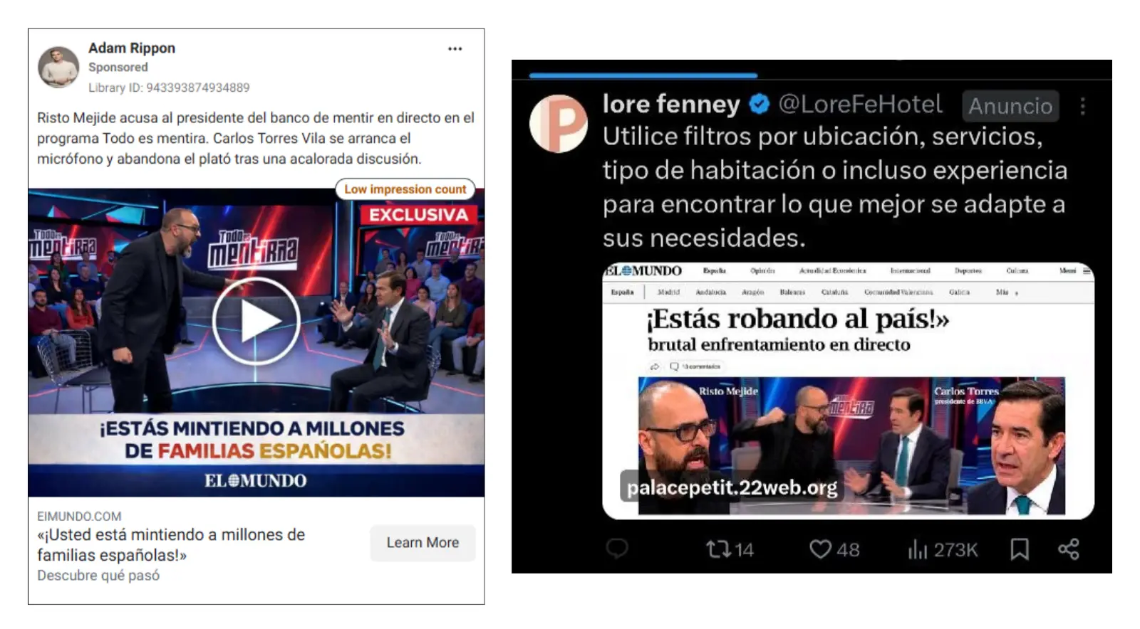 Captura de datosEstas cuentas publicaron anuncios dirigidos a al menos 33 países diferentes, por ejemplo, Chile o Malasia, o miembros de la UE como Portugal, Rumanía o Suecia, usando la imagen de más de 150 personas famosas en esos lugares (muchas de ellas fallecidas recientemente) y de distintos medios de comunicación nacionales. Normalmente, una misma cuenta comparte anuncios para varios países, mientras la información de transparencia de Meta indica que las páginas tienen administradores en países como Vietnam, Ucrania o Estonia.