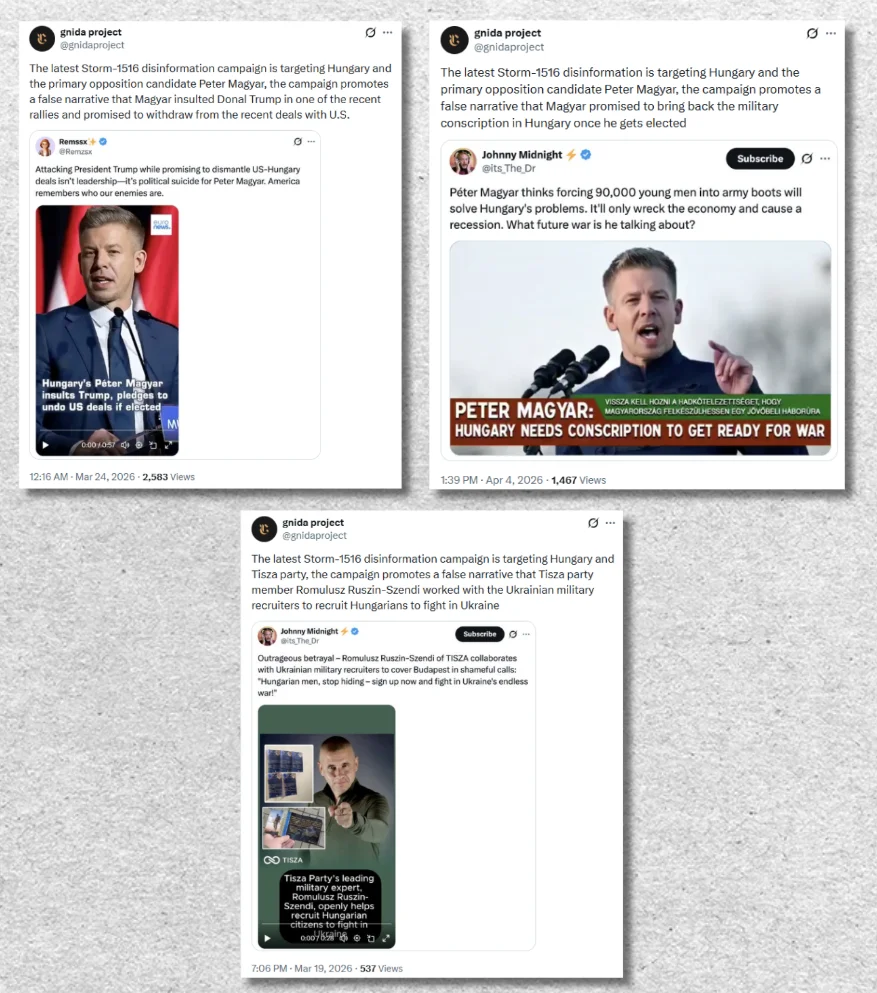 El Gnida Project, un blog y cuenta de X que se encarga de monitorear y analizar las campañas de Storm-1516 (una operación de influencia rusa que ha intentado influir en otros comicios como Alemania), ha identificado varias campañas enfocadas en las elecciones húngaras. Una de estas campañas, recogidas por Lakmusz, acusaba de pedofilia a Gábor Iványi, un sacerdote líder de la Hermandad Evangélica Húngara (MET) crítico de Orbán. Según explican los verificadores húngaros, el origen de la desinformación estaba en un artículo falso con errores lingüísticos y frases mal redactadas publicado el 20 de febrero por un sitio web llamado Oknyomozó Riport (creado solo un par de días antes, algo habitual en este tipo de campañas).