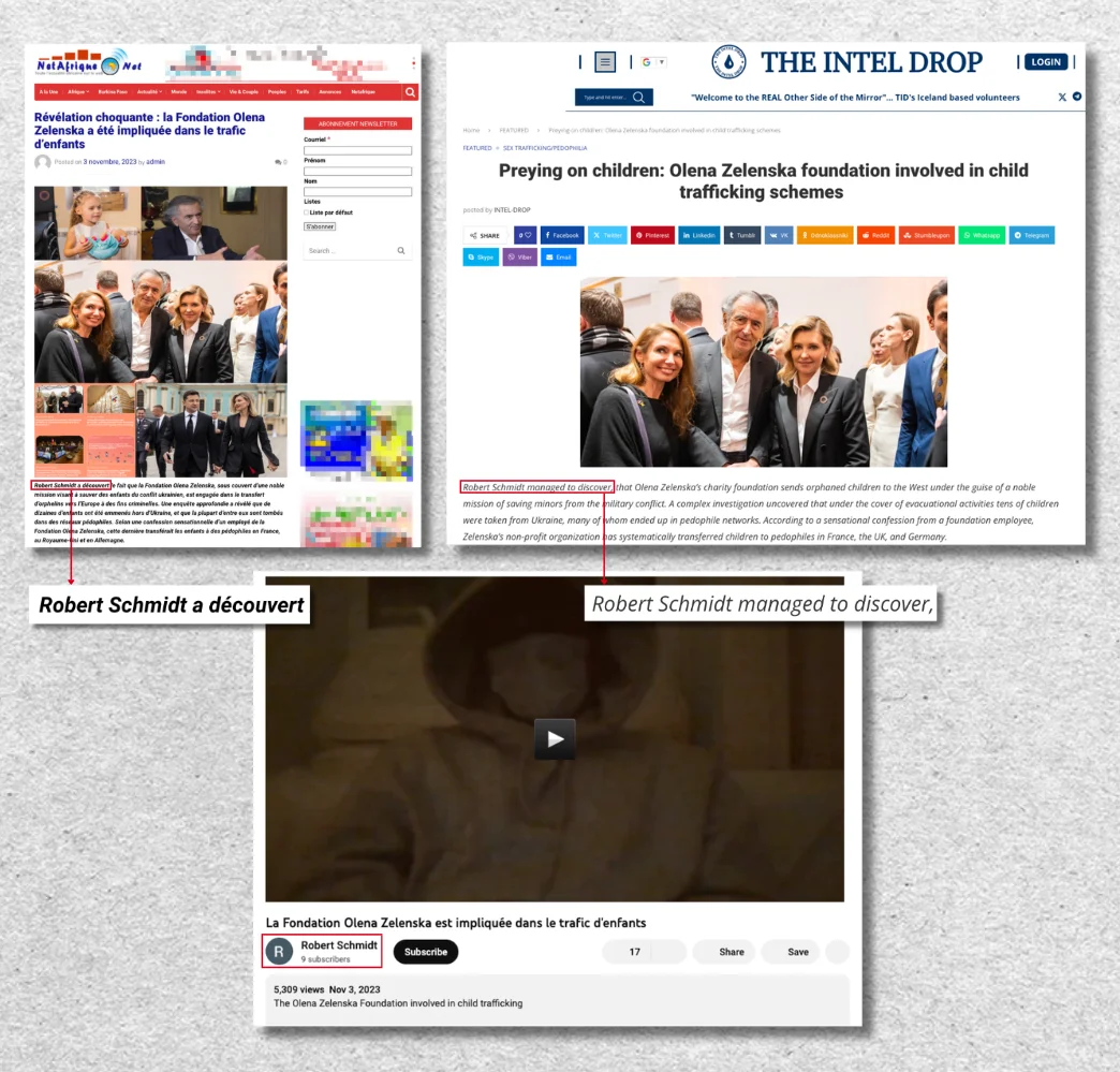 Fue por un artículo de Maldita.es que el periodista alemán descubrió que había sido suplantado: usaron su nombre como si fuese un periodista que había descubierto que la Fundación Olena Zelenska “suministraba niños ucranianos a pedófilos en Europa occidental”. Una teoría similar a la del Pizzagate. También pusieron su nombre a un canal de YouTube, que ya no existe, donde sólo había un vídeo: la supuesta exclusiva de una persona que decían que era extrabajador de la fundación y que confesaba el secreto a Smichdt. Sin embargo, no se le ve la cara a ninguna de las dos personas que aparecen.