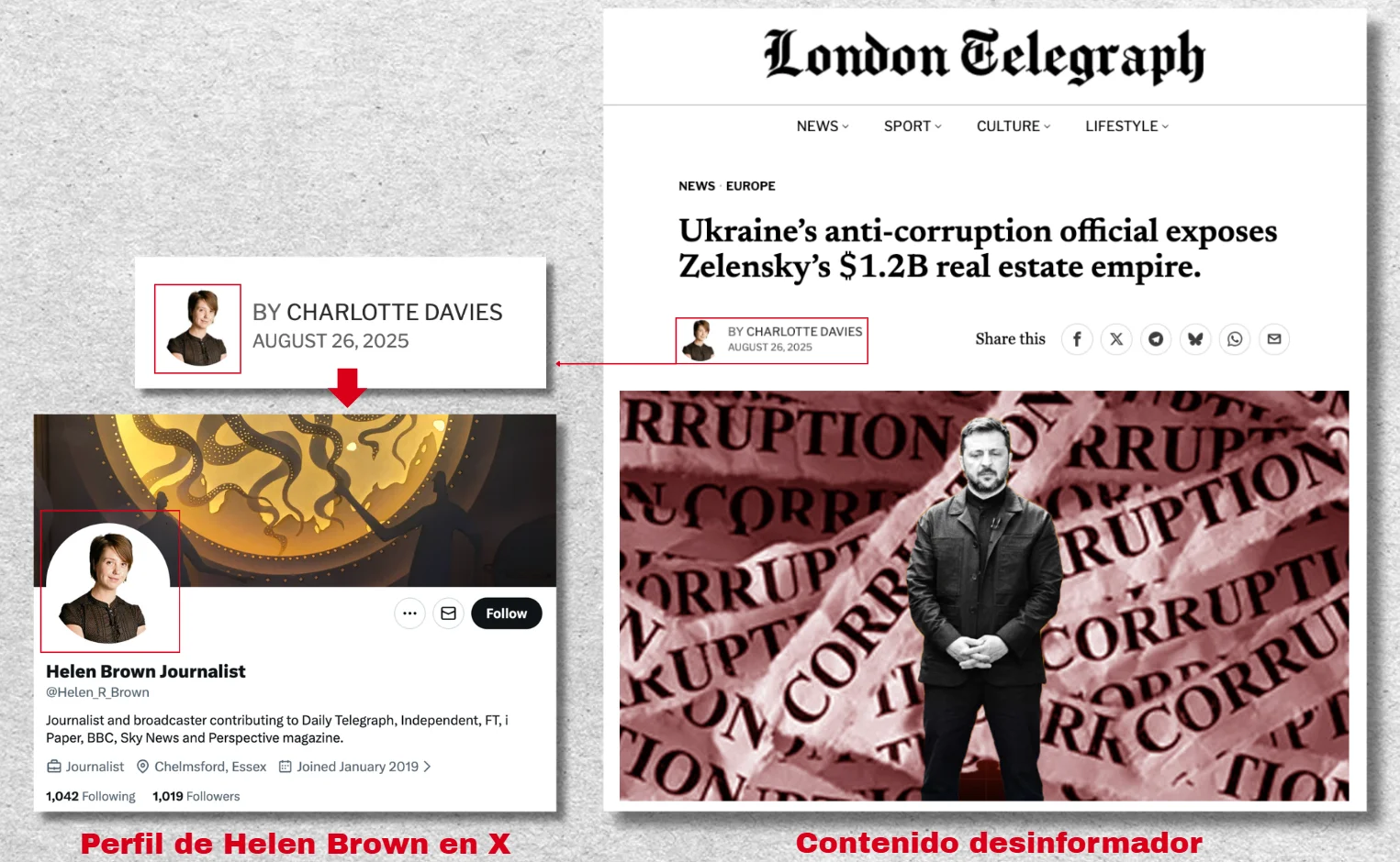 Unos meses antes, la periodista Helen Brown, del británico The Telegraph, donde escribe sobre cultura, también se sorprendió cuando un día alguien le avisó de que su foto estaba firmando un texto que decía que Zelenski había sido atrapado enun esquema de corrupción multimillonario, un tema que queda lejos de los contenidos sobre música o teatro de los que Brown suele escribir. Junto a la firma aparecía su foto, concretamente la que usa en su perfil de Twitter (ahora X). A diferencia de Víctor Cousin, que fue suplantado con foto y nombre, solo aparecía la foto de Brown, pero el nombre era “Charlotte Davies”.