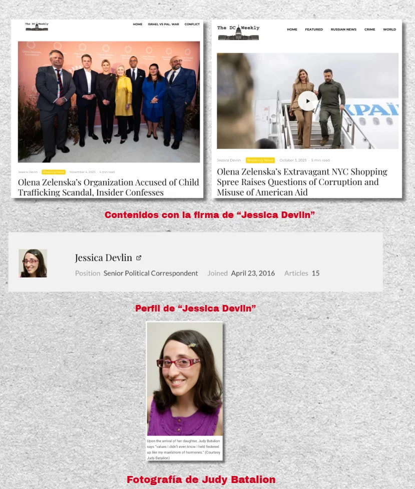 Justo en el DC Weekly apareció suplantada la escritora canadiense Judy Batalion, cuyos libros han sido traducidos a múltiples idiomas. Aunque no con su nombre (le pusieron Jessica Devlin), sino con su foto. Tenía incluso una biografía: “Jessica Devlin es una periodista distinguida y aclamada, cuya carrera la ha llevado a algunas de las regiones más críticas y desafiantes del mundo. Nacida y criada en la vibrante metrópolis de Nueva York, la pasión de Jessica por la narrativa y su compromiso con la búsqueda de la verdad han impulsado su notable trayectoria en el periodismo”.