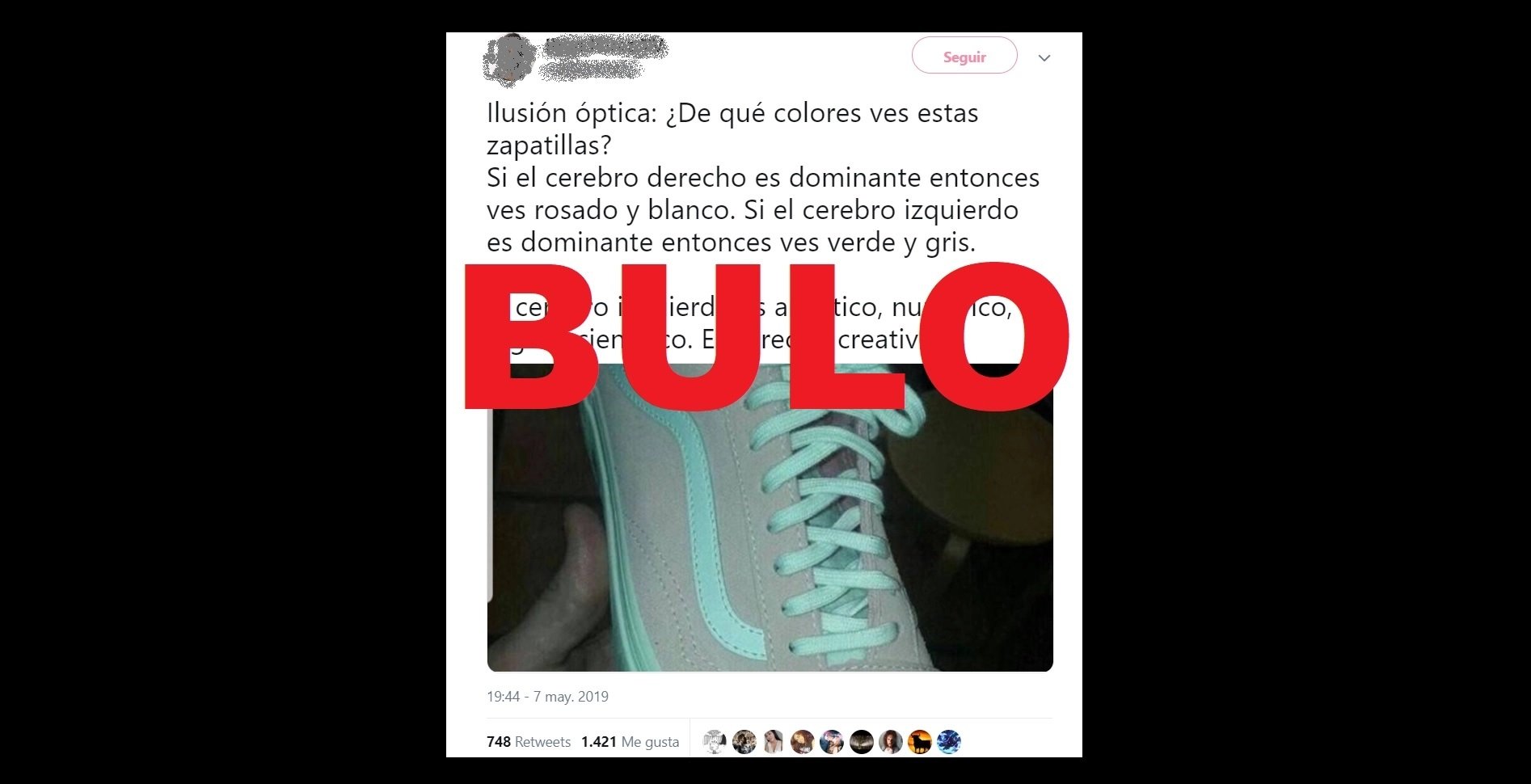 Desde hace varios días circula por los WhatsApps de España la fotografía de una zapatilla en una iluminación extraña que cada uno parecemos percibir de distinto color: o bien rosa y blanca o bien gris y verde. Junto a la foto va una supuesta explicación de esas diferencias: si te domina el hemisferio derecho del cerebro, verás la zapatilla rosa, y si te domina el izquierdo, lo verás gris.