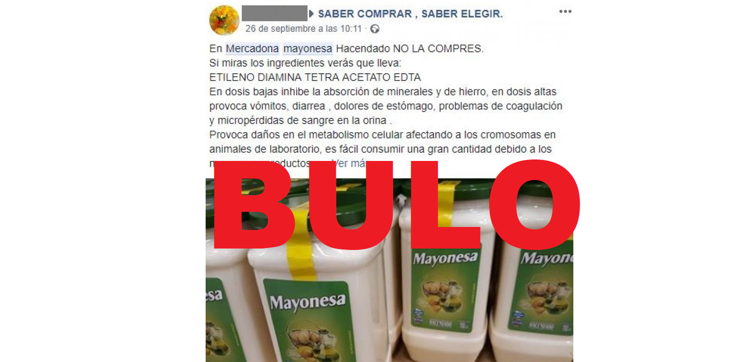 Lleva varios meses circulando pero resurge de vez en cuando: un post de facebook, ya reconvertido en imagen, por el que nos habéis preguntado vía WhatsApp y también habéis comentado en nuestra Buloteca. En él se detallan los ingredientes de la mayonesa Hacendado (marca blanca de Mercadona) y se comentan sus supuestos efectos, bien mezclados con una alta dosis de alarmismo y poca solidez científica.