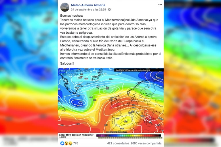Nos habéis consultado por un contenido de Facebook, publicado el pasado 24 de septiembre, que afirma que "dentro de 15 días" habrá otra DANA en el Mediterráneo, "incluida Almería". En esta publicación se incluye un mapa de predicción meteorológica y el siguiente texto: