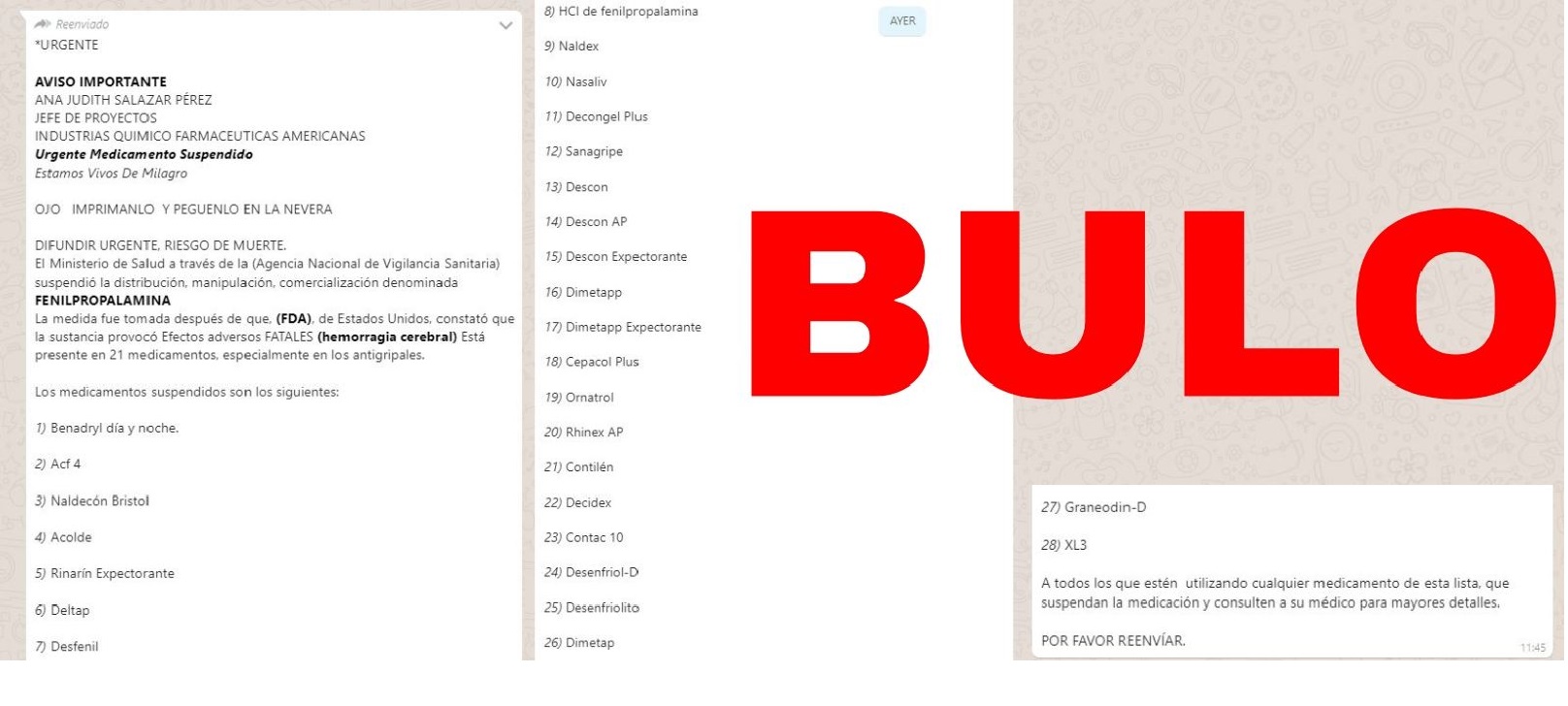 Esta cadena, que afirmaba que había riesgo de muerte por la ingesta de medicamentos con fenilpropanolamina, tiene su origen en una nota informativa que publicó el Ministerio de Salud de Brasil en el año 2000. Entonces, estos medicamentos fueron retirados del mercado. Sin embargo, actualmente no hay ninguna alerta de esas características.