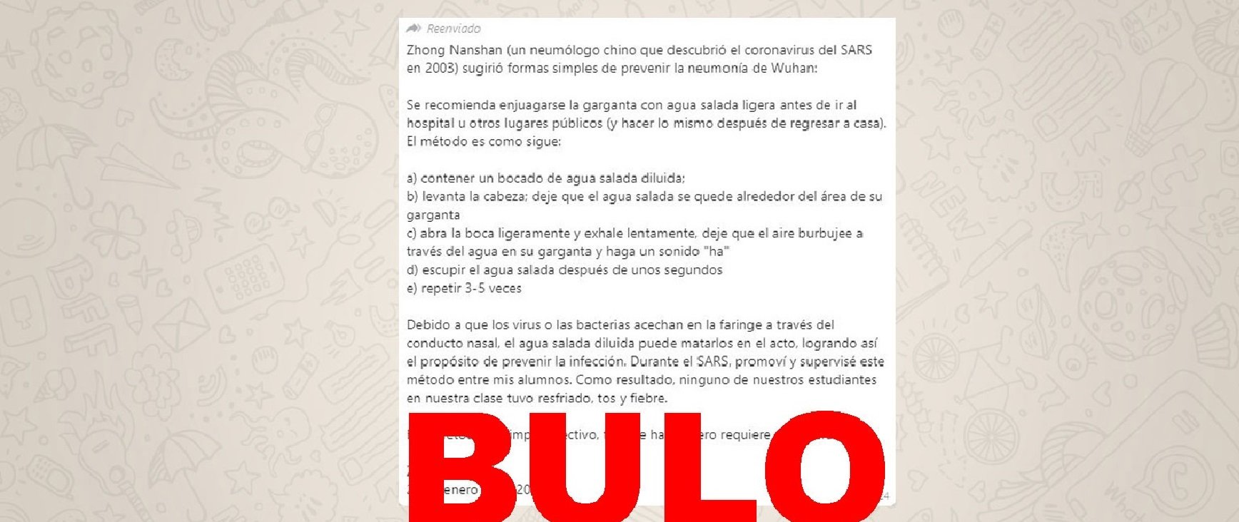 Se mueve por WhatsApp una cadena en la que un médico llamado Zhong Nanshan habría recomendado "enjuagarse la garganta con agua salada ligera antes de ir al hospital u otros lugares públicos" con tal de no contraer el coronavirus. No hay ninguna prueba de que esto sea así e incluso el equipo de Nanshan ha negado que sea un método efectivo para prevenir el coronavirus.