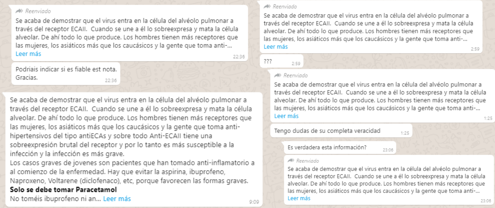 La hipótesis detrás de este supuesto es que el coronavirus se une a una enzima llamada ECA2 (en el mensaje de WhatsApp pone ECAII) para infectar las células, y que las personas que toman este tipo de medicación tendrían más cantidad de esa enzima, facilitando la infección y agravando sus efectos.