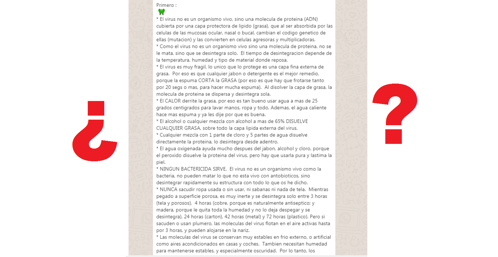 Últimamente, muchos de vosotros nos habéis preguntado por una cadena de WhatsApp en la que se dan una serie de datos y consejos para prevenir y combatir el contagio por coronavirus. Aunque parte de la información que aporta es correcta, otros de los datos que proporciona no lo son. Te contamos lo que sabemos sobre ella.