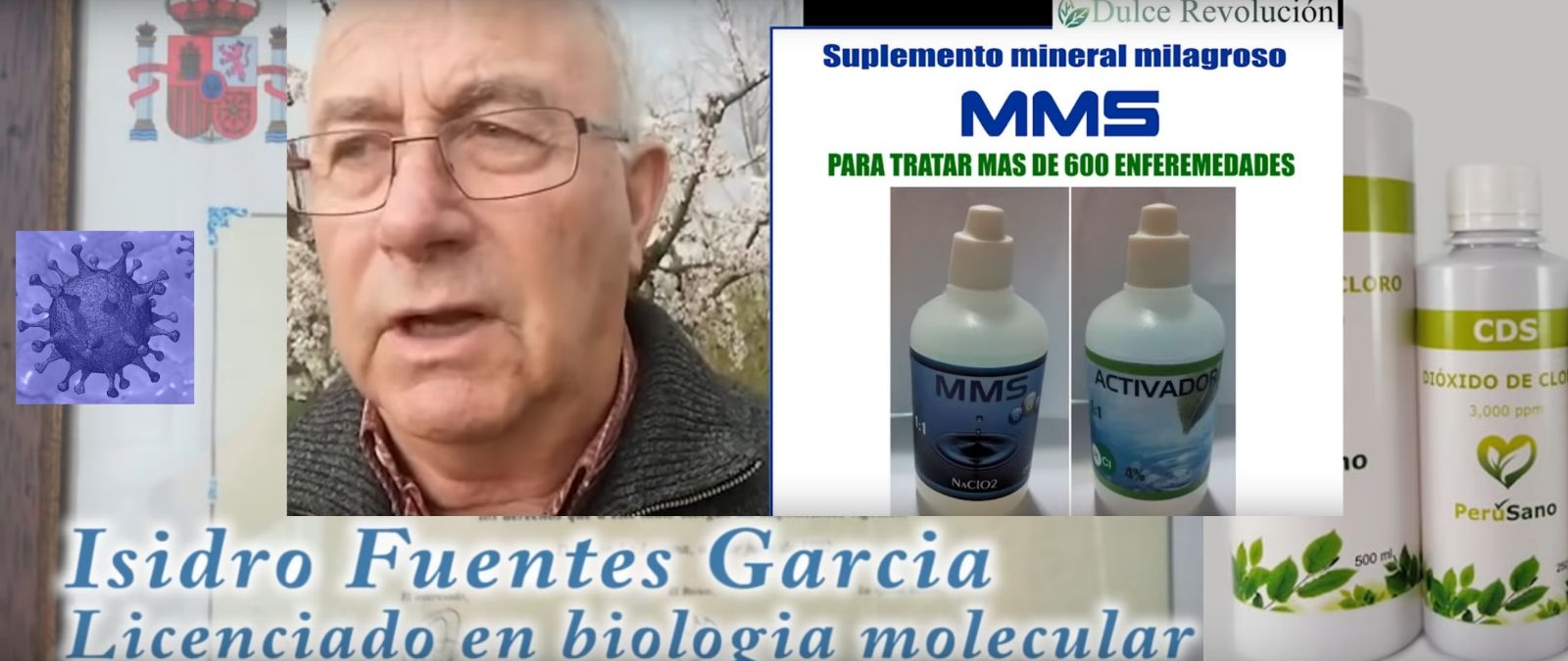 Un audio de Isidro Fuentes García, supuesto biólogo y un vídeo de Josep Pamiès, multado por la Generalitat por la promoción de pseudoterapias para curar enfermedades, se están viralizando. El vídeo ha sido retirado.* En él se aconseja el MMS o clorito de sodio como solución en 24 horas contra el coronavirus. No hay ninguna prueba que sirva contra el COVID-19. Como ya os explicamos aquí, es uno de tantos falsos remedios contra esta pandemia.