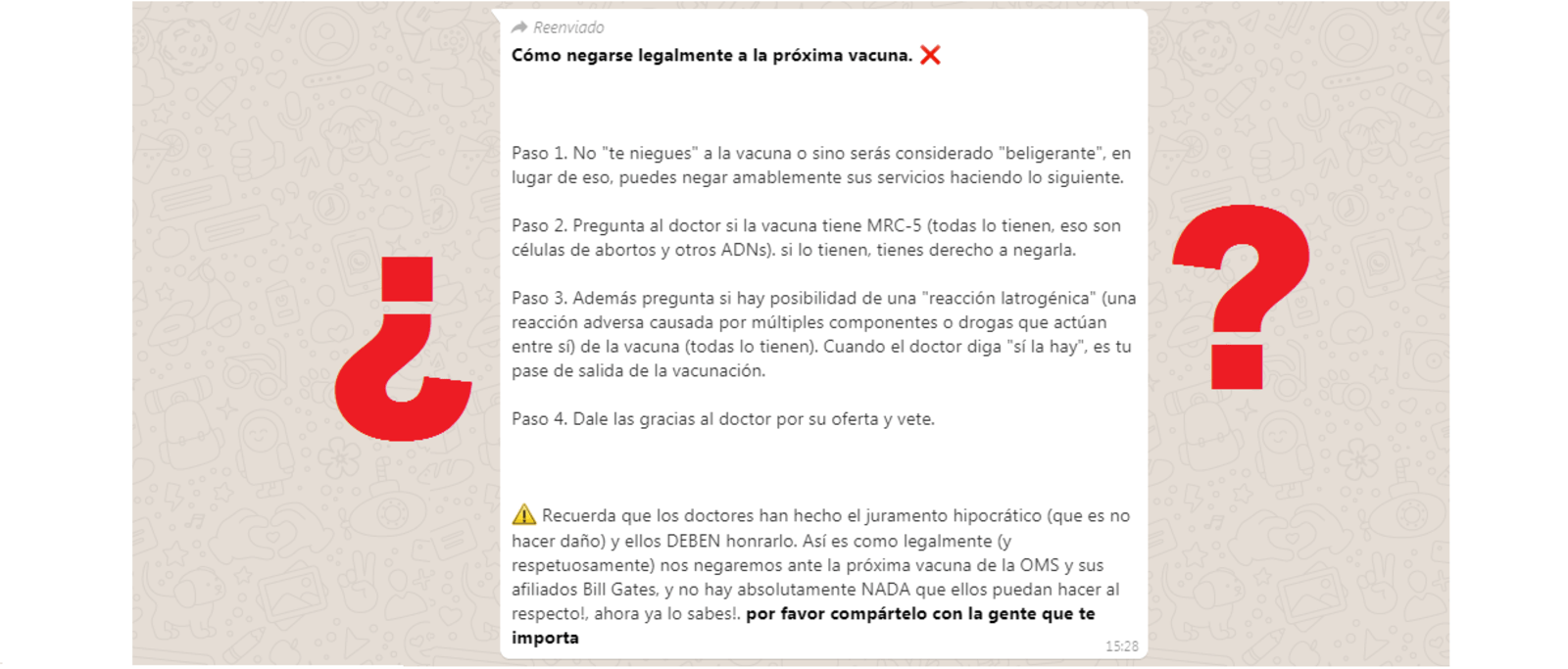 Por último, en el mensaje se recomienda preguntar al médico si hay posibilidad de una "reacción latrogénica" de la vacuna”. “Todas la tienen. Cuando el doctor diga ‘sí la hay’, es tu pase de salida de la vacunación”, afirma el mensaje.