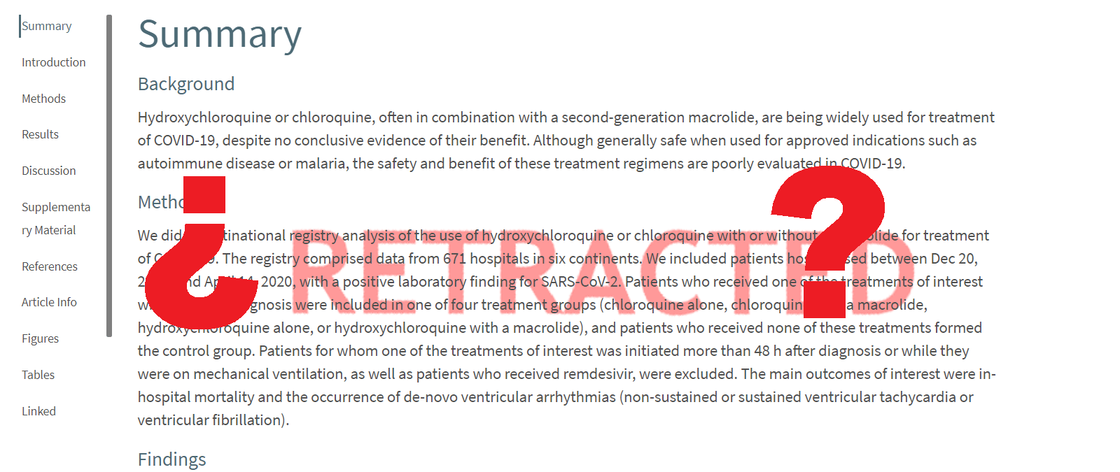 El artículo publicado el pasado 22 de mayo en The Lancet (y que ahora ha sido retractado) era el primer gran estudio que analizaba la eficacia de la hidroxicloroquina como potencial tratamiento de COVID-19. Supuestamente se había observado a 96.000 pacientes de 671 hospitales. Casi 15.000 tomaron hidroxicloroquina o cloroquina, con y sin antibióticos.