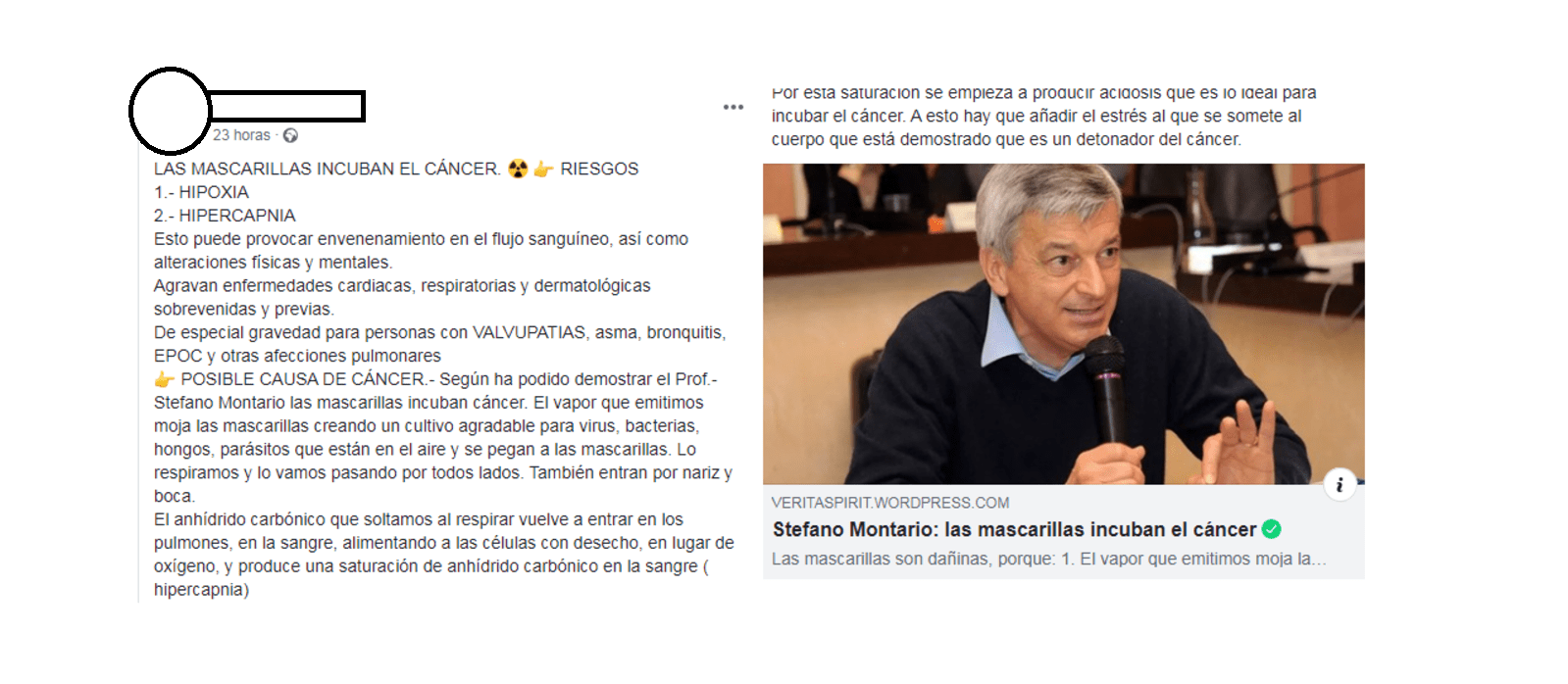 Nos habéis preguntado por un post de Facebook que dice que las mascarillas incuban el cáncer y que los riesgos de utilizarla son la hipoxia (falta de oxígeno en el organismo) y la hipercapnia (exceso de dióxido de carbono), lo que podría "provocar el envenenamiento en el flujo sanguíneo, así como alteraciones físicas y mentales". Además, menciona a un supuesto doctor, Stefano Montanari, que afirma que los virus, bacterias, hongos y parásitos que se pegan a la mascarilla al respirar, junto con el anhídrido carbónico que expulsamos y volvemos a inhalar por culpa de esta "es lo ideal para incubar el cáncer".