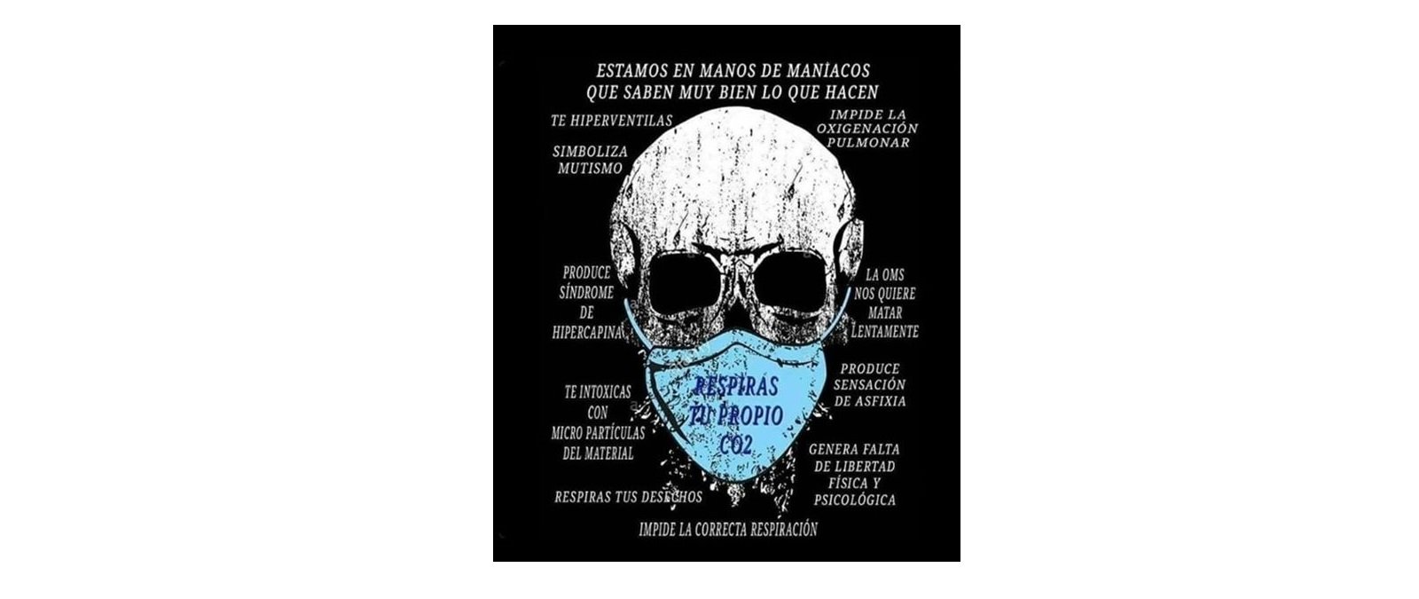 Nos habéis preguntado por una imagen de una calavera que lleva una mascarilla y está rodeada por varios mensajes. El principal es que usarla hace que respires tu propio dióxido de carbono. Es un bulo.