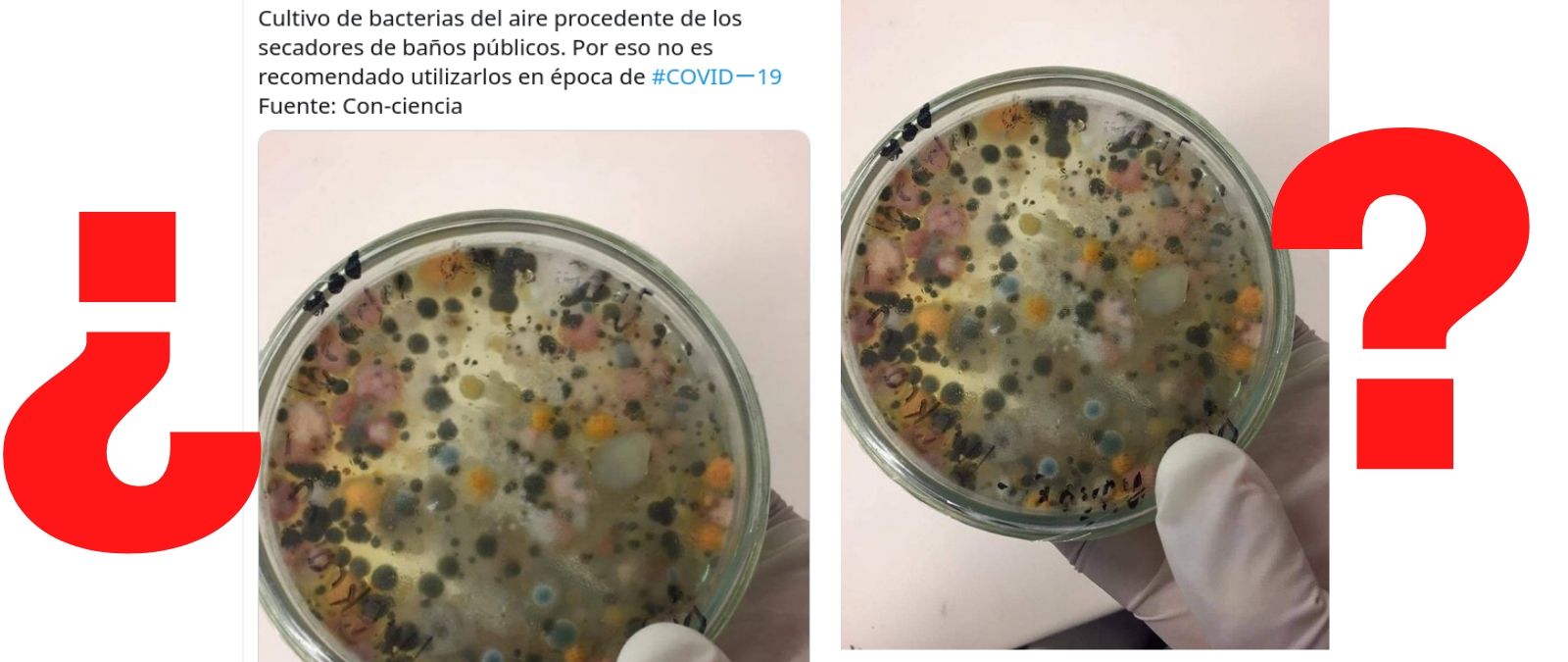 La imagen de un cultivo realizada en una placa de Petri con el aire de los secamamanos de un baño público se ha viralizado como argumento para no usarlos durante la pandemia de la COVID-19. ¿Pero qué nos dice realmente esta imagen?