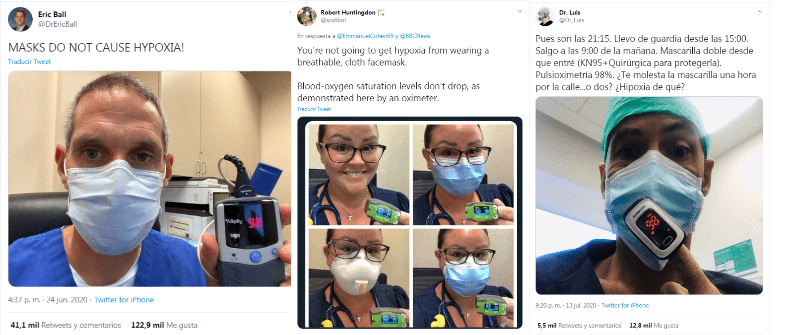 Ante los bulos virales que atacan el uso de mascarillas por supuestamente afectar a la salud, profesionales sanitarios han publicado en redes sociales fotos y vídeos en los que cuentan que tras horas de usar mascarillas, se han colocado un pulsímetro y los niveles de oxígeno en su sangre son perfectamente normales.