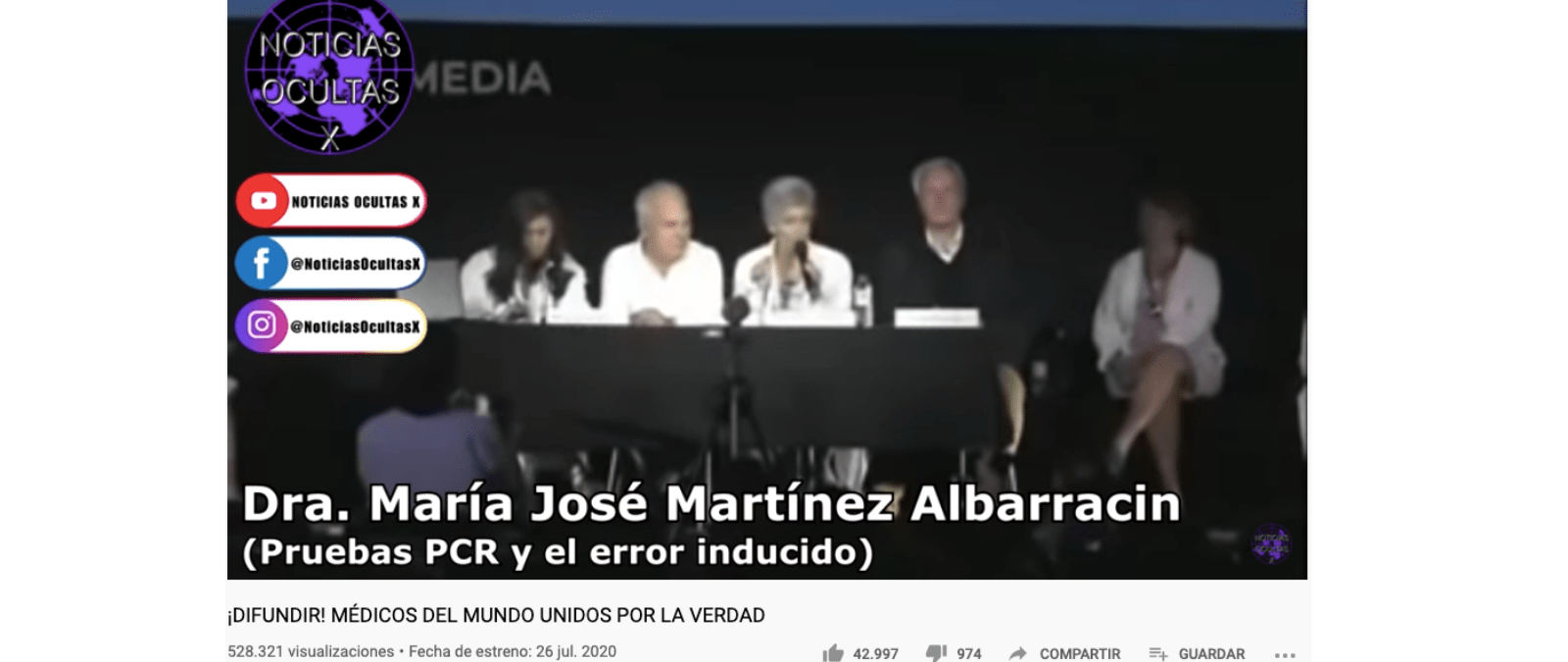 Otra de las afirmaciones durante la asamblea de este grupo de médicos, esta vez según la homeópata María José Martínez Albarracín, es que las pruebas PCR (reacción en cadena de la polimerasa) no determinan el virus infeccioso. En teoría, para realizarlas, se lleva a cabo “un aislamiento más que dudoso” y que "se basa en el SARS-CoV-1 incompleto", ya que "este tiene unos 29.903 nucleótidos y la prueba apenas detectan unos 200”, por lo que podría estarse amplificando otro tipo de virus. En definitiva, Martínez Albarracín defiende que “a una epidemia no puede dársele la publicidad que se le está dando sin clínica (estudio de los síntomas) y basándose solo en una prueba diagnóstica”.