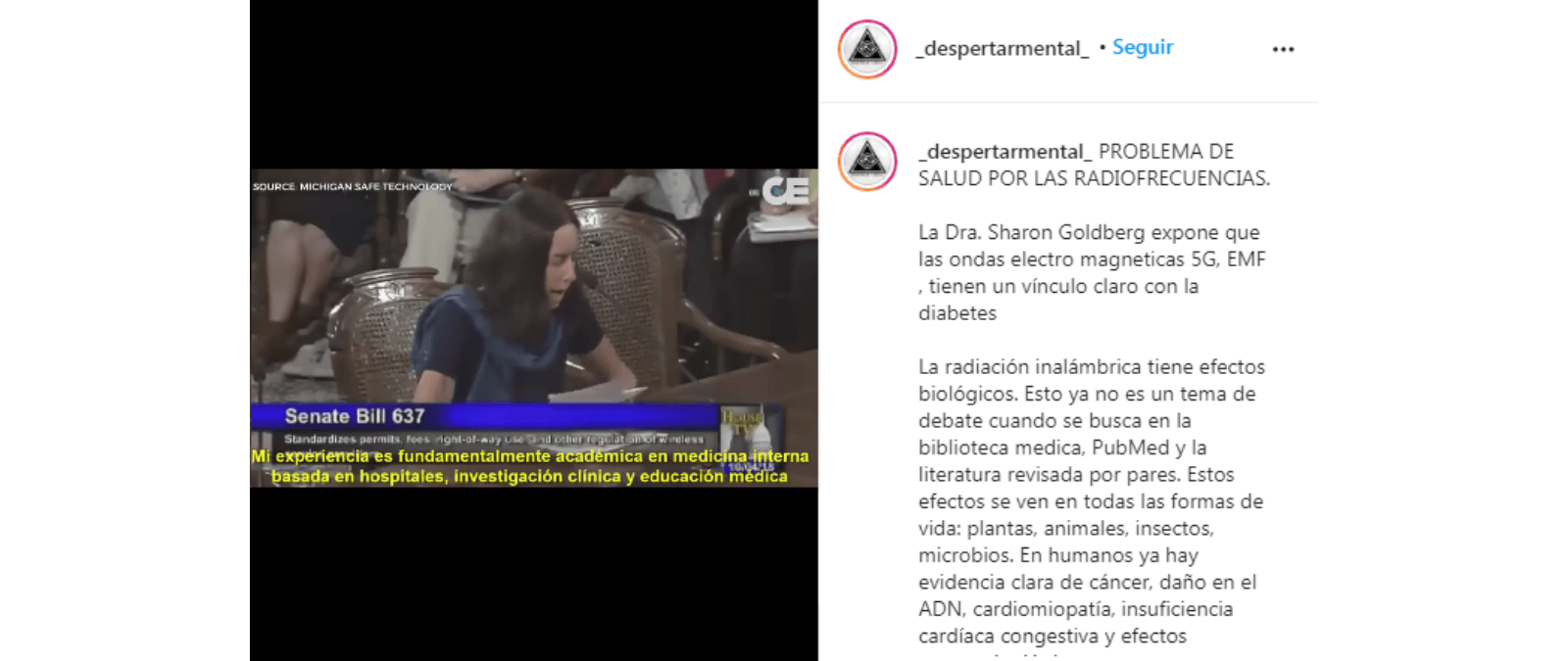Nos habéis preguntado por un vídeo que está circulando por Instagram y otras redes sociales en el que Sharon Goldberg, que practica la medicina integrativa o alternativa (considerada una pseudociencia) y que está vinculada a movimientos contra las radiaciones desde hace años, afirma que la radiación inalámbrica "está relacionada con un alto nivel de azúcar en sangre y con la diabetes" y que "tiene efectos biológicos demostrados en humanos". También que esto está respaldado por la literatura científica.