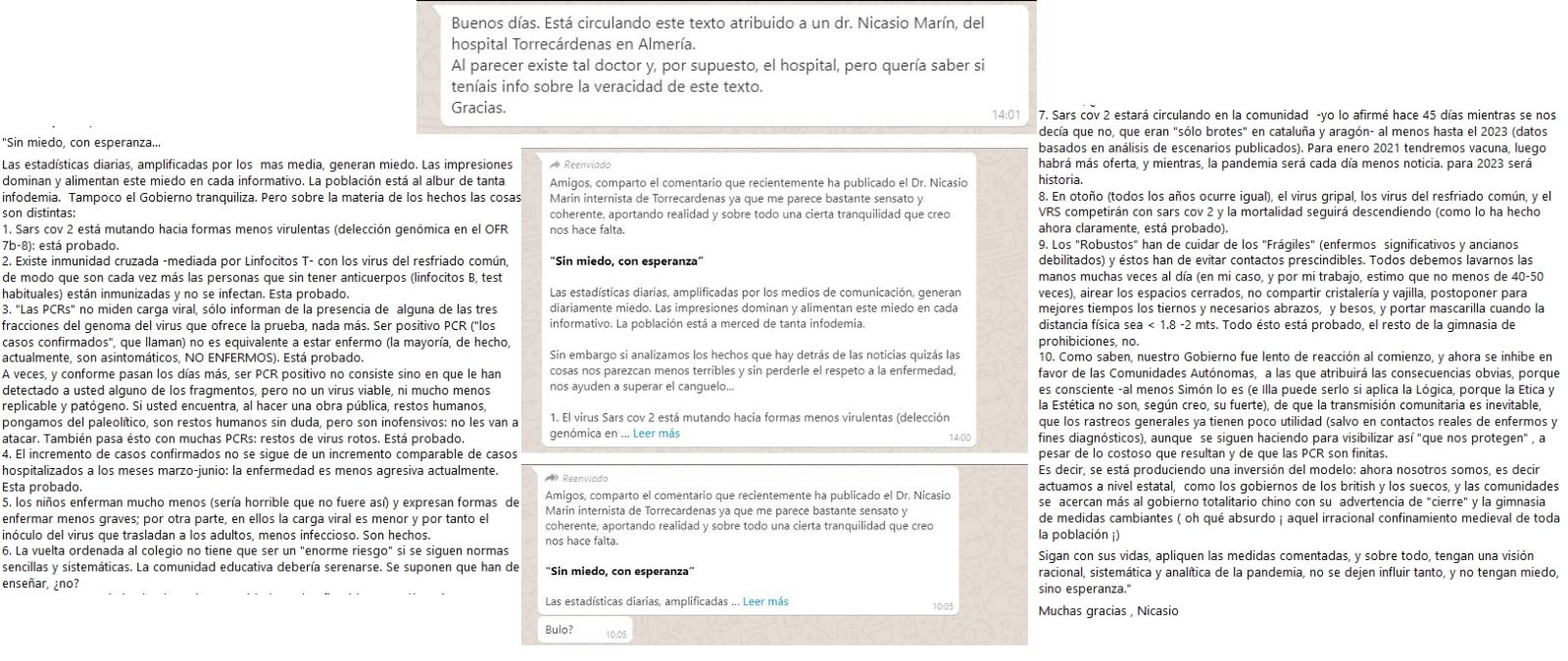 Se ha viralizado como cadena un artículo de opinión titulado 'Sin miedo, con esperanza' publicado en Tele Almería Noticias escrito por el médico internista Nicasio Marin Gámez sobre el coronavirus. Hemos verificado el contenido y mezcla afirmaciones no probadas, con otras falsas y algunas ciertas. Os explicamos lo qué sabemos de cada uno de los 10 puntos del artículo.