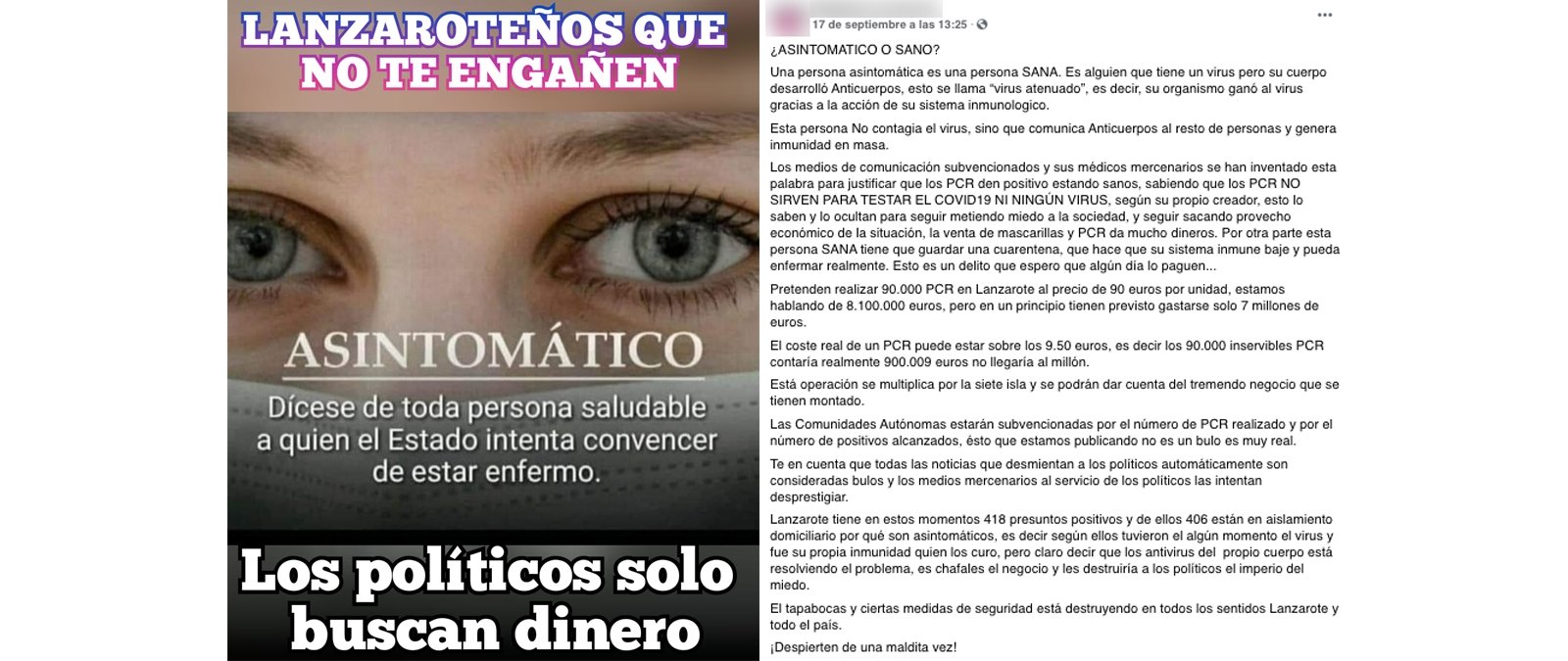 Se está compartiendo por Facebook una publicación en la que se afirma que una persona asintomática "no contagia el virus, sino que comunica anticuerpos al resto de personas y genera inmunidad en masa". También se asegura que "las PCR no sirven para testar el COVID-19 ni ningún virus, según su propio creador" y que la cuarentena hace que "el sistema inmune baje". Además, este post publicado el 17 de septiembre afirma que la isla de Lanzarote tiene "418 presuntos positivos y de ellos 406 están en aislamiento domiciliario porque son asintomáticos".