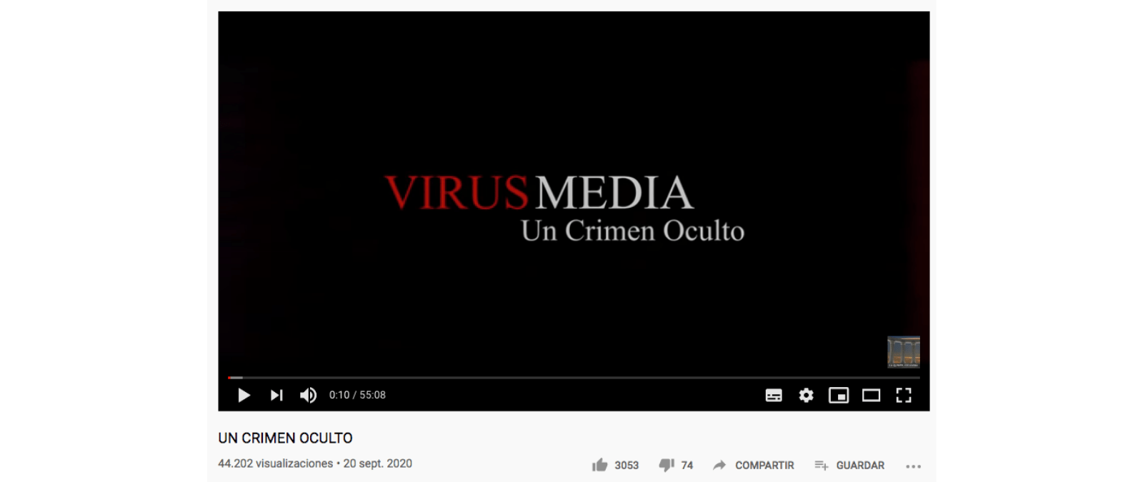 Más de una decena de afirmaciones falsas y mentiras en un solo vídeo. Se distribuye en Youtube, dura 55 minutos y se titula 'Un crimen oculto', un "documental que desmonta la falsa pandemia". En él, miembros de la plataforma negacionista de la COVID-19 "Medicos por la verdad" ponen en duda desde la existencia del virus hasta la utilidad de las medidas de prevención como el uso de mascarillas o el confinamiento. Afirmaciones falsas o sin evidencia científica. Os contamos cuáles son.