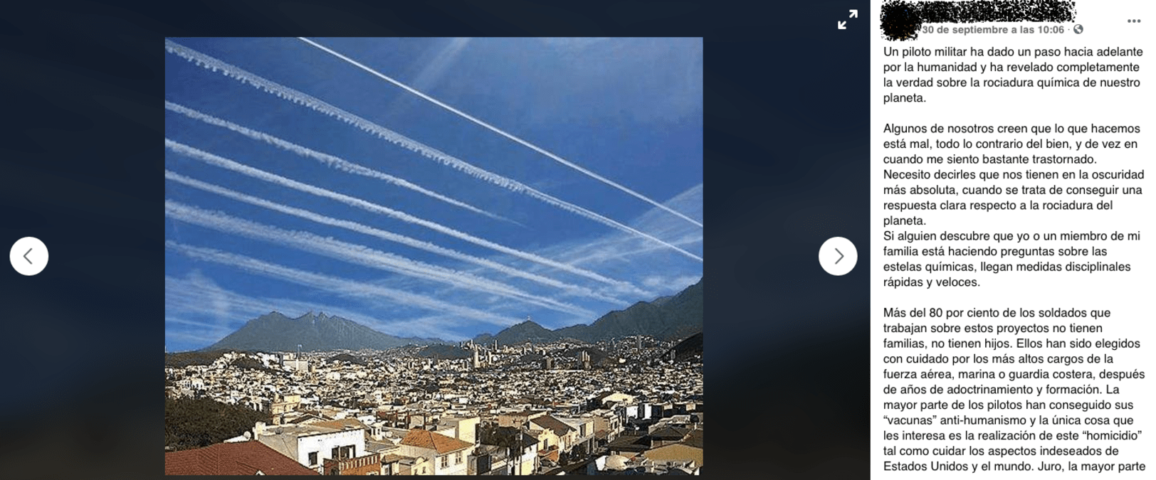 Circulan por Facebook posts como este en el que se habla de la teoría sin evidencia científica de los chemtrails, una teoría conspiranoica que afirma sin pruebas que existen unas maniobras de difusión de sustancias químicas en la atmósfera con fines oscuros aunque poco determinados. En este, concretamente, se menciona a un supuesto piloto que habria participado en esas maniobras y que habría confesado su existencia, para qué se realizan y cómo.