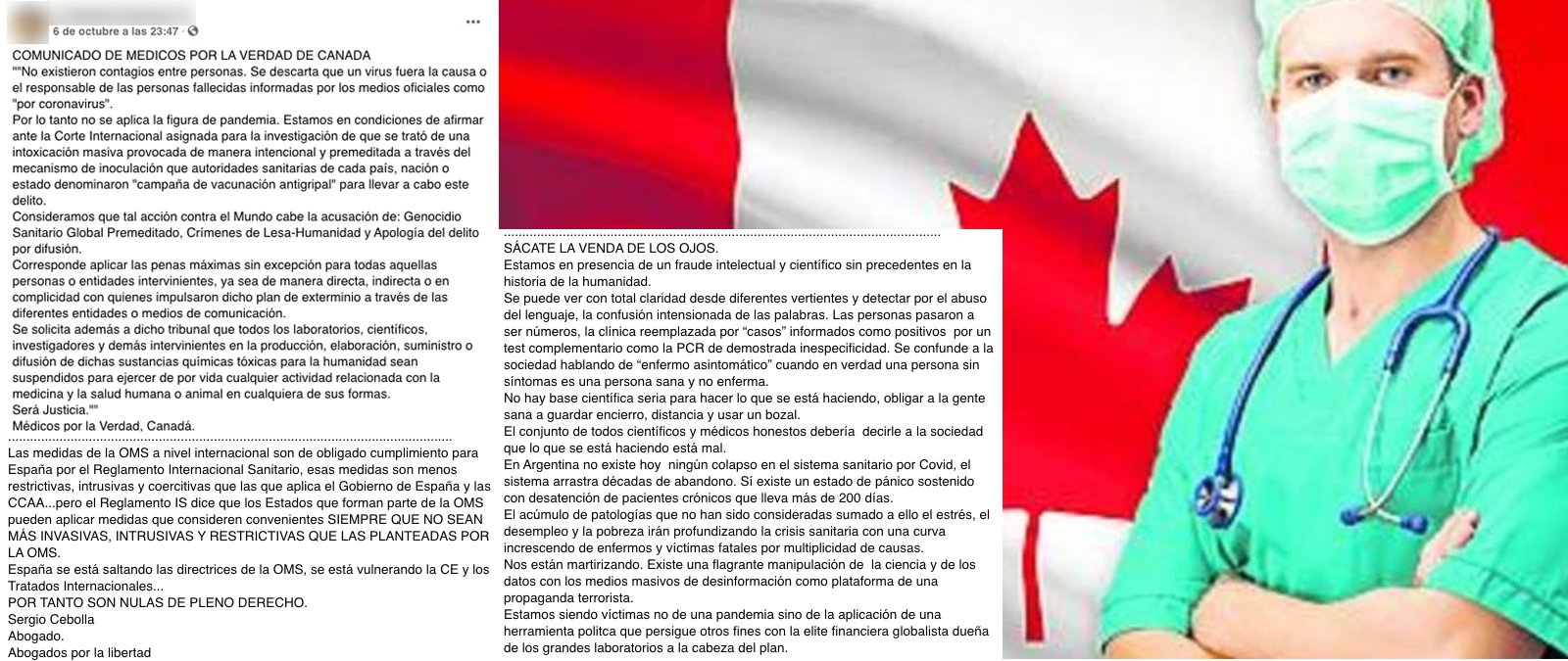 El supuesto comunicado de "Médicos por la Verdad de Canadá" dice que la pandemia fue causada por "una intoxicación masiva provocada de manera intencional y premeditada a través del mecanismo de inoculación que autoridades sanitarias de cada país, nación o estado denominaron 'campaña de vacunación antigripal'".
