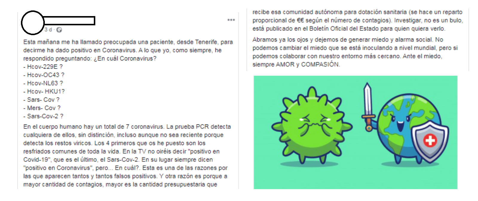 Tanto el texto como la imagen señalan que "las prueba PCR detectan cualquier coronavirus, sin distinción, incluso aunque no sea reciente, porque detecta los restos víricos".