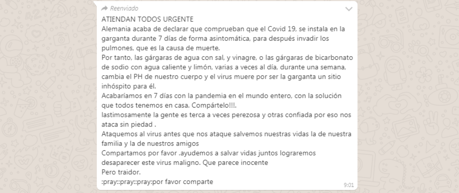 Nos habéis preguntado por una cadena de WhatsApp llena de afirmaciones falsas como que el virus que causa la COVID-19, el SARS-CoV-2, "se instala en la garganta durante 7 días de forma asintomática para después invadir los pulmones, que es la causa de la muerte". Para evitarlo, propone realizar gárgaras con diferentes líquidos y mezclas, como agua con sal y vinagre o bicarbonato con agua caliente y limón. Esto, según el texto, "cambiaría el pH de nuestro cuerpo", haciendo que el "virus muriese". "Acabaríamos en 7 días con la pandemia en el mundo entero", concluye. Esto es falso: ni estas mezclas cambian el pH de nuestra garganta ni aunque lo hiciesen acabarían con el virus.