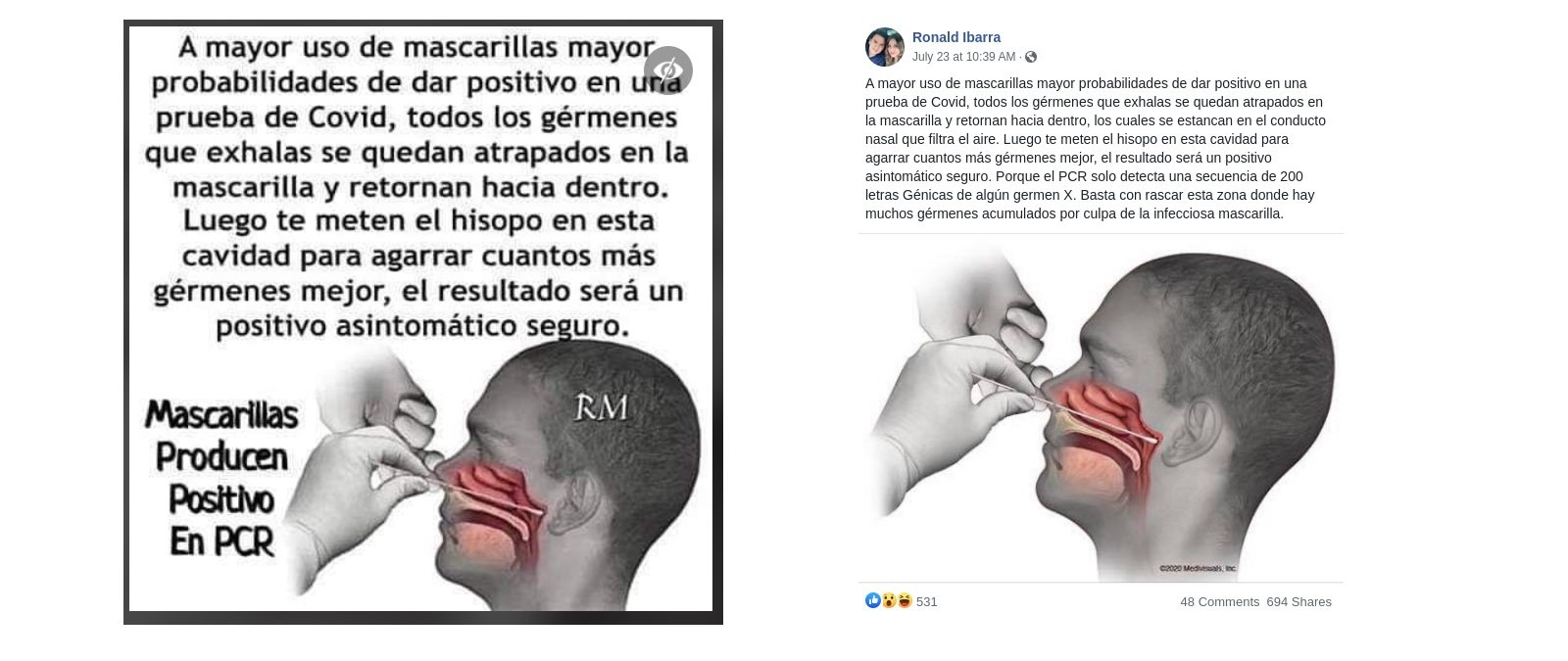 En las publicaciones se afirma que el test PCR “solo detecta una secuencia de 200 letras Génicas [sic] de algún germen X” y que “basta con rascar esta zona, donde hay muchos gérmenes acumulados por el uso de la infecciosa mascarilla”.