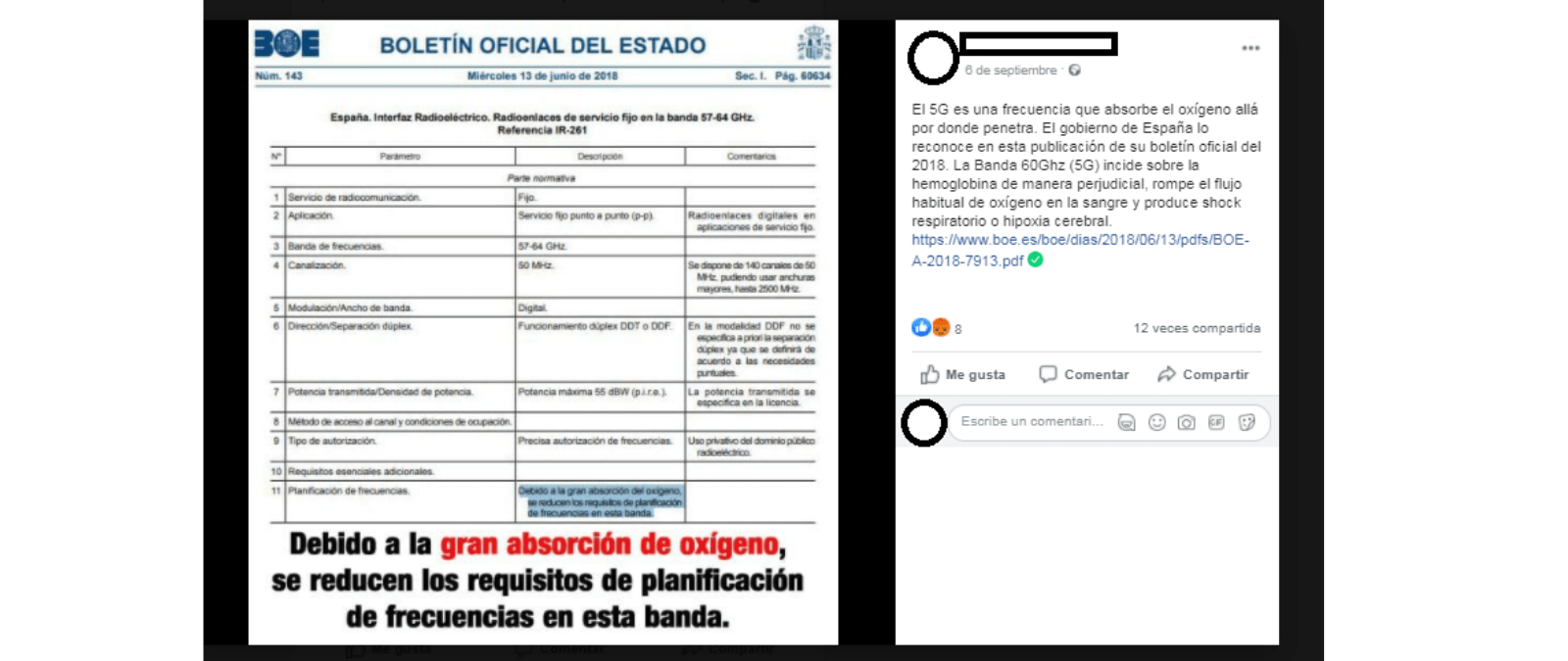 Nos habéis preguntado por un post de Facebook que dice que "el 5G es una frecuencia que absorbe el oxígeno allá por donde penetra". Para sostener esta afirmación, incluye una captura de pantalla de una disposición general del Boletín Oficial del Estado (BOE), en una de cuyas tablas (Anexo I) se puede leer que "debido a la gran absorción del oxígeno, se reducen los requisitos de planificación de frecuencias en esta banda".