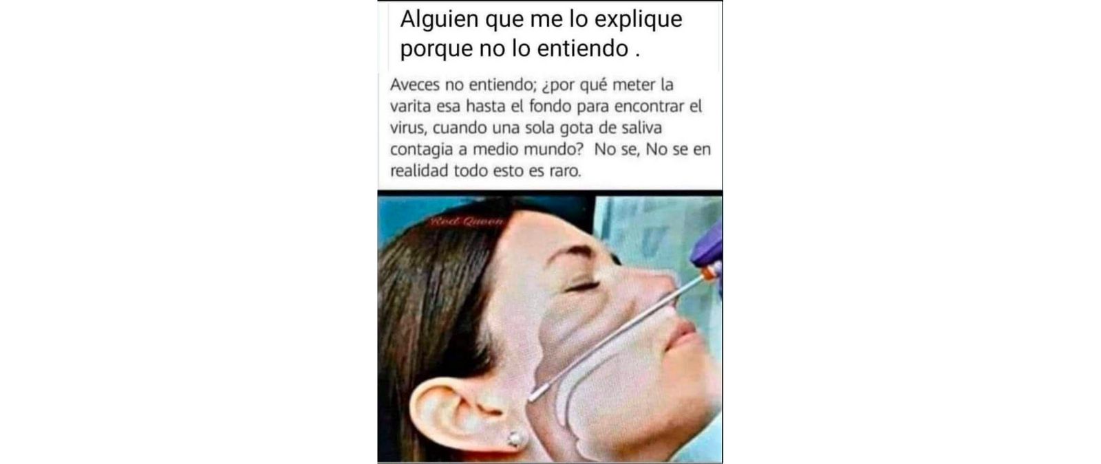 Circula en redes sociales una imagen que pone en cuestión la toma de muestra a través de una torunda ("la varita esa") "hasta el fondo para encontrar el virus, cuando una sola gota de saliva contagia a medio mundo" que se necesita para realizar la PCR que detecta el coronavirus.