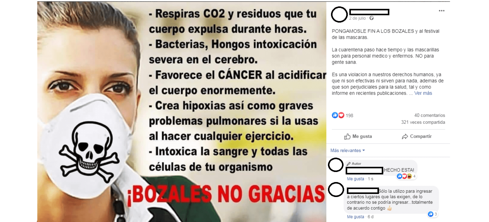 Nos habéis preguntado por una imagen que circula por Facebook y atribuyendo al uso de mascarillas consecuencias que ya hemos desmentido en Maldita.es, como que hacen que respiremos los residuos de nuestro propio cuerpo, que favorecen el cáncer, que causa hipoxia o que intoxica la sangre. Os recordamos lo que sabemos al respecto.