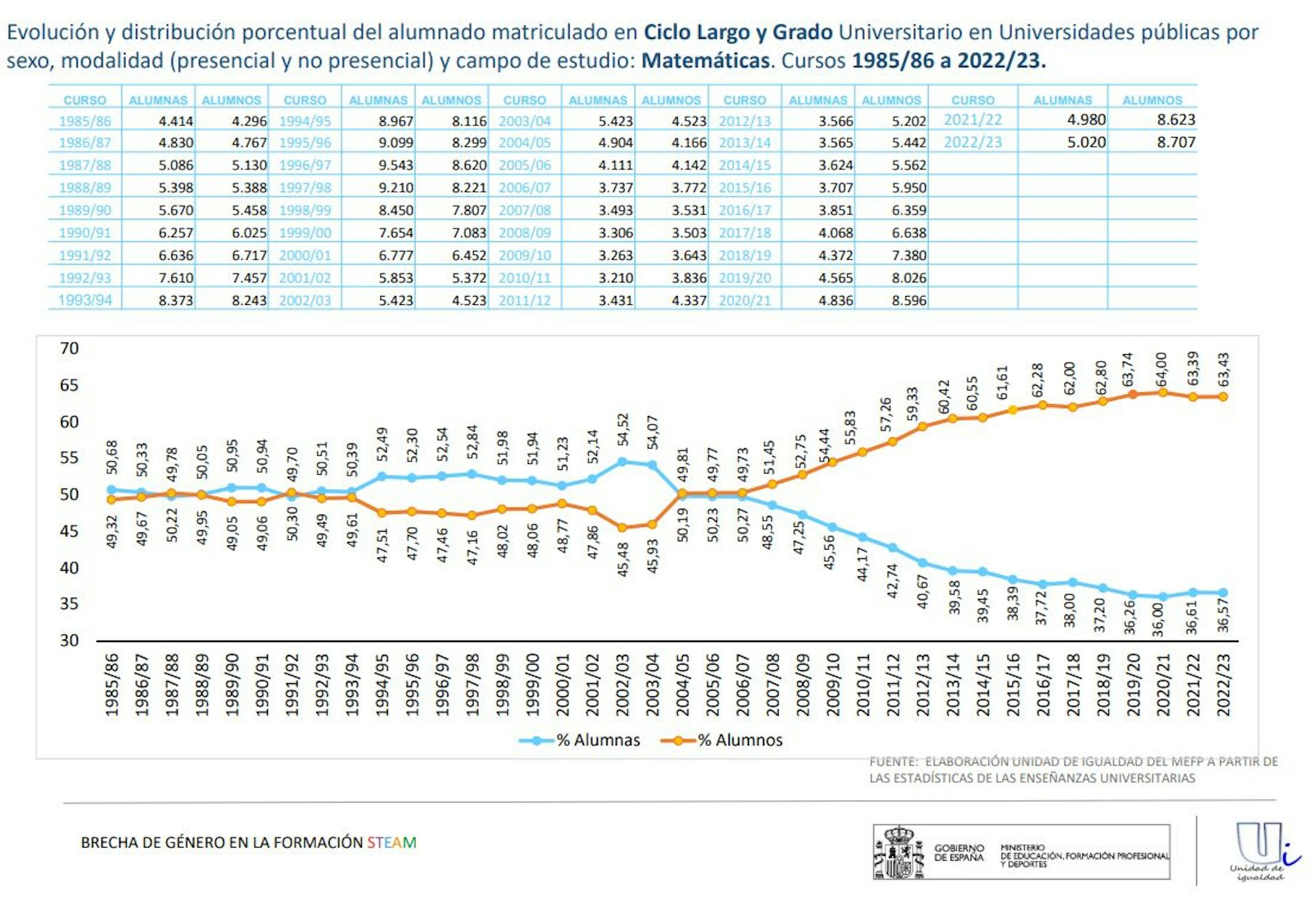 Como se puede observar, el porcentaje de alumnas fue mayor que el de alumnos entre los años 1994 y 2007. "Ahora está bajando la matriculación", apunta Macho. "Sin embargo, se cree (pero no hay pruebas) que es por el éxito de las matemáticas en estos últimos años, que desvinculan la carrera de la enseñanza".