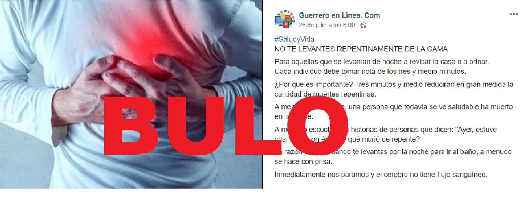 En un lenguaje dramático típico de este tipo de mensajes, se advierte que al levantarse de golpe puede que el flujo sanguíneo al cerebro no sea suficiente, se produzca un desmayo y "se muera de repente durante la noche sin motivo".