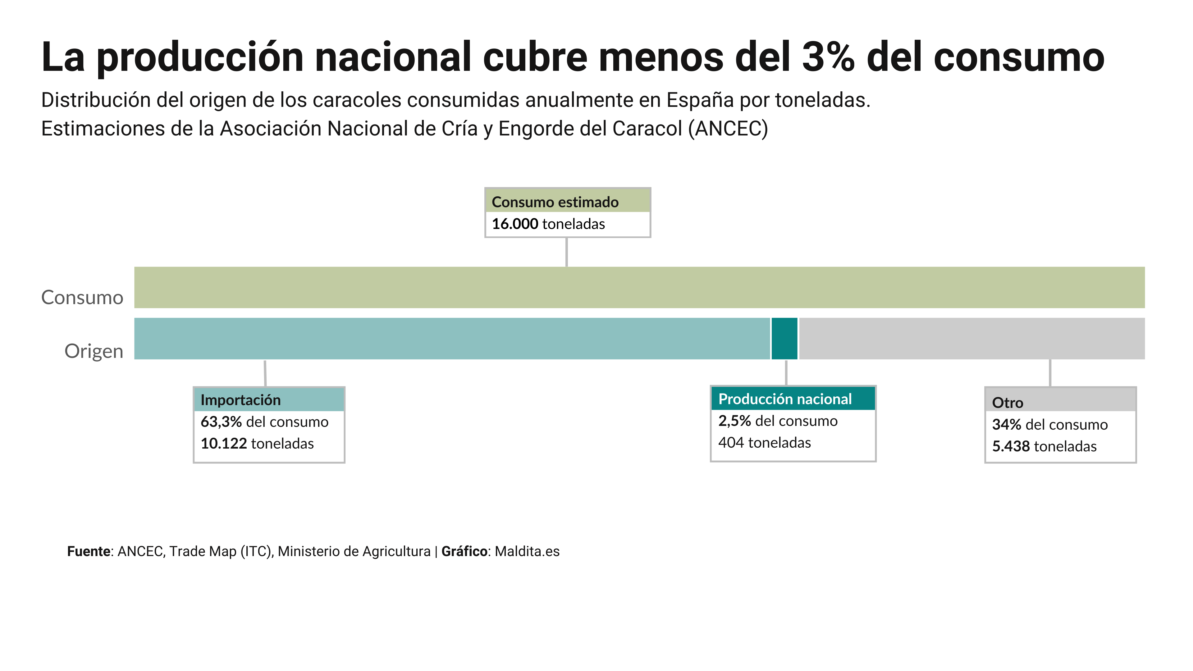 La producción anual de caracoles estimada en España gira en torno a las 440 toneladas anuales, aproximadamente el 2,5% del consumo. En lo que respecta al comercio exterior, en 2024 España fue el país que más caracoles importó del mundo, en su mayoría (89%) desde Marruecos. El Ministerio de Agricultura asegura que el caracol que se importa desde Marruecos, es un caracol “muy específico y que prácticamente solo se consume en Andalucía”. Además, aseguran que no “compite con el caracol producido en España, ya que es de una tipología diferente y un escaso valor, por lo que en ningún caso se criaría en nuestro país”.