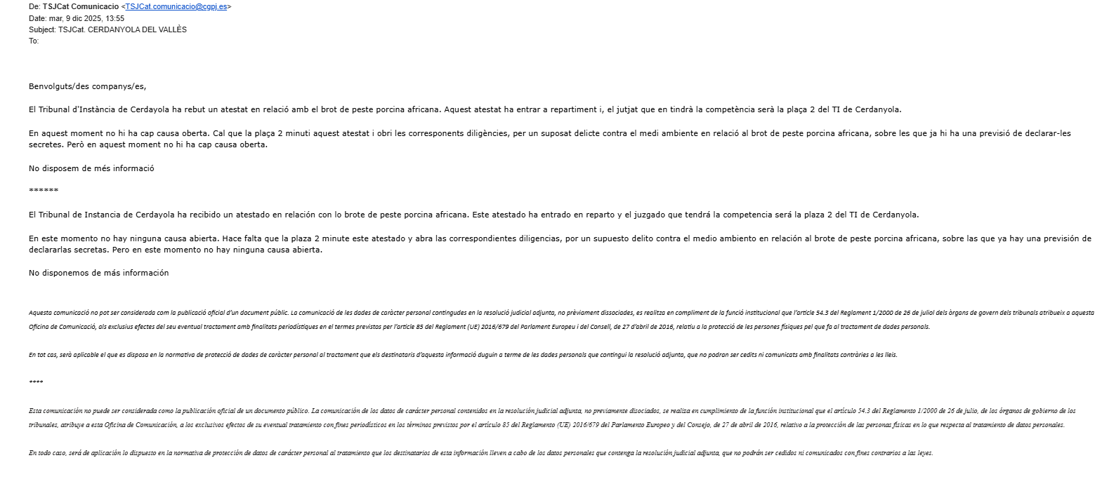 A 11 de diciembre no la hay, pero podría abrirse próximamente. El 9 de diciembre de 2025, el Tribunal Superior de Justicia de Cataluña (TSJC) comunicó que no había ninguna causa abierta sobre el origen del brote de PPA, pero que el Tribunal de Instancia de Cerdanyola había recibido un atestado en relación con el brote de PPA que investigan conjuntamente Guardia Civil y Mossos d’Esquadra. Para que se abra una investigación judicial, el juzgado tiene que valorar si hay indicios mínimos de delito y, si procede, abrir las correspondientes diligencias, en este caso por un supuesto delito contra el medioambiente. Según esa comunicación del TSJC, se prevé que esas diligencias se declaren secretas.