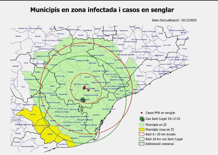 El 19 de diciembre de 2025, el Laboratorio Central de Veterinaria de Algete, el Laboratorio Nacional de Referencia para la enfermedad en España, confirmó la detección de un nuevo caso de PPA en Sant Cugat del Vallès, dentro del radio de 20 km establecido como zona infectada, y a 6 km de los confirmados en Cerdanyola del Vallès. Con ese nuevo positivo, se ha notificado la presencia de la PPA en un total de 27 jabalíes.