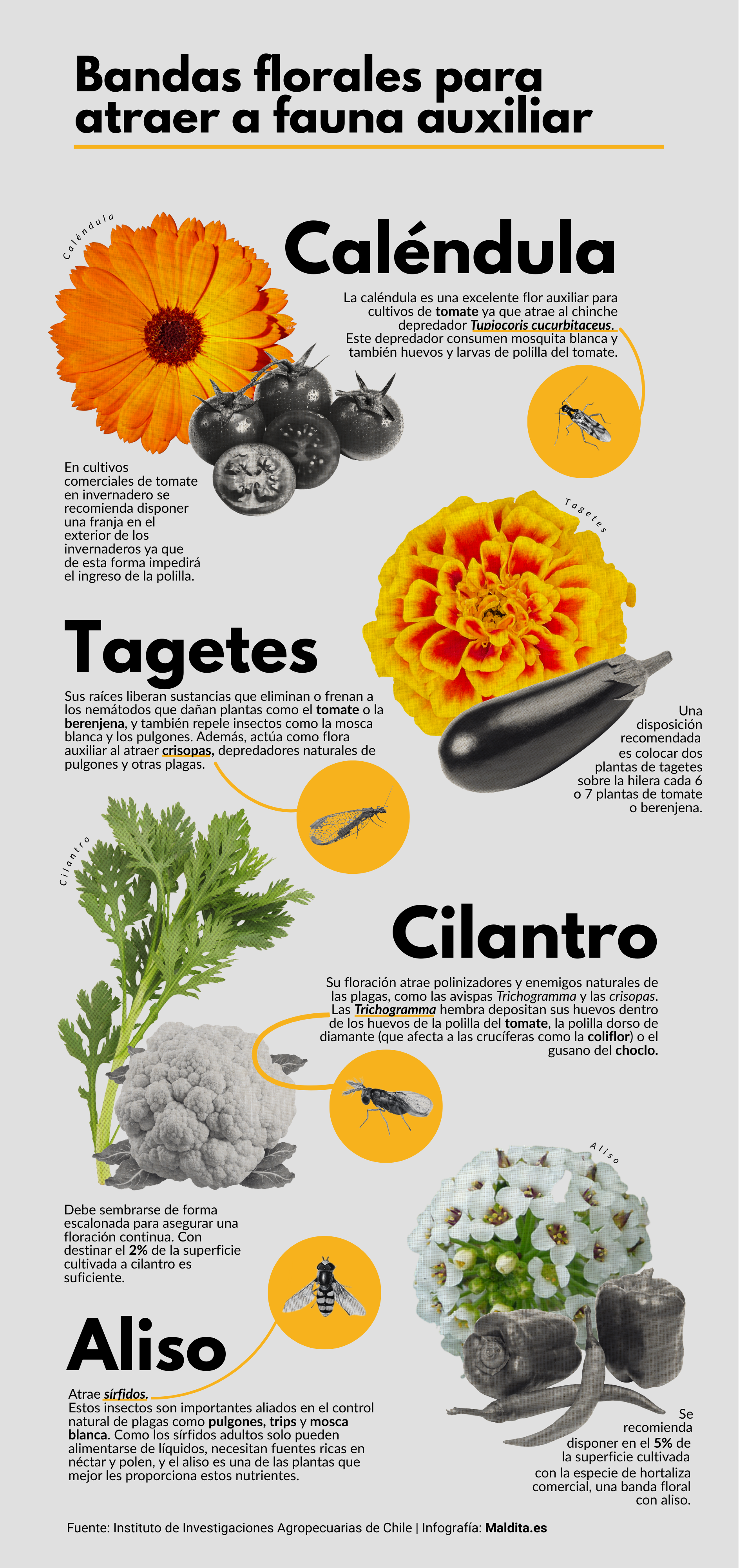 Las bandas florales son uno de los mecanismos utilizados para aumentar la biodiversidad en los cultivos, tanto vegetal como animal, cuyo objetivo principal es frenar las plagas. “Se trata de alineaciones de plantas –denominada flora funcional– que se colocan en los márgenes de los cultivos o en el perímetro de la finca o parcela, y de las que no esperamos cosechar nada”, explica a Maldita.es Francisco Javier Olivares, profesor de jardinería y maldito que nos ha prestado sus superpoderes.