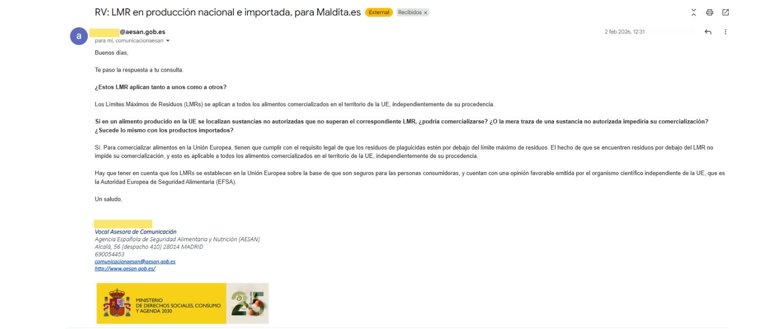 “Hay que tener en cuenta que los LMR se establecen sobre la base de que son seguros para las personas consumidoras, y cuentan con una opinión favorable emitida por el organismo científico independiente de la UE, que es la Autoridad Europea de Seguridad Alimentaria (EFSA, por sus siglas en inglés)”, concluye la AESAN.